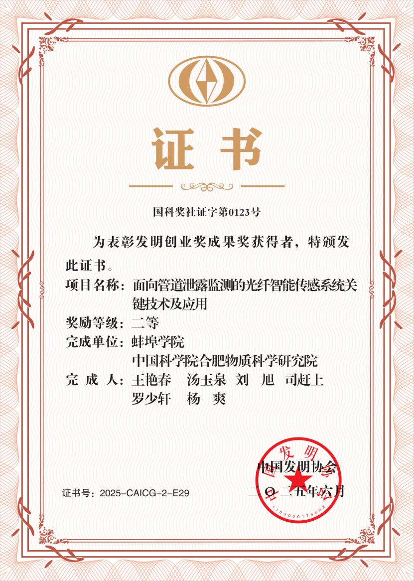 近日,中国发明协会公布了2025年度“发明创业奖”获奖名单。由世界杯官网作为第一完成单位,电子与电气工程学院王艳春教授团队牵头,联合中国科学院合肥物质科学研究院共同申报的“面向管道泄漏监测的光纤智能传感系统关键技术及应用”项目,荣获“发明创业奖成果奖二等奖”。该项目依托安徽省智能感知与控制工程研究中心,面向城市管道安全监测领域的重大需求,突破了高灵敏度传感器设计、长距离低损耗传输及智能诊断算法等多项技术难题,成功研制出具有自主知识产权的面向管道泄漏监测的光纤智能传感系统。该系统关键性能指标优于同类对标产品,整体技术达到国内先进水平,为城市生命线健康监测装备的转型升级提供了坚实支撑。“中国发明协会发明创业奖”于2005年经科技部批准设立,是在国家科学技术奖励办公室注册登记的社会力量设奖,被誉为我国发明创新领域的最高荣誉之一,具备国家科学技术奖提名推荐资格。该奖项由国家科学技术部、中华全国总工会、国家知识产权局等多家部委与组织机构共同支持,在全国范围内享有广泛的权威性和社会影响力。近年来,2026世界杯官网始终以服务地方经济社会发展为己任,紧密对接安徽省重大战略需求,深度融入蚌埠市五大产业集群建设,积极助