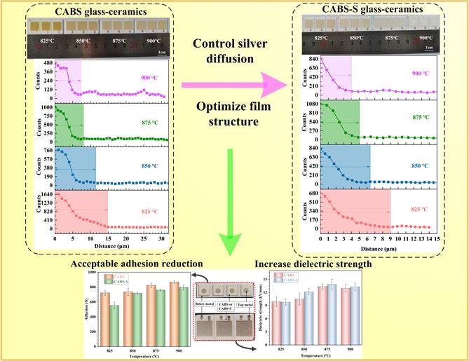 该研究采用简单的厚膜印刷法替代LTCC、HTCC构筑陶瓷多层电路板,对降低陶瓷多层电路板制作成本具有重要意义。该研究工作中,通过调控硼硅酸盐微晶玻璃组分,配制绝缘电子浆料,与商用Ag浆料体系匹配,经过印刷-烧结的循环叠层工艺实现陶瓷Ag film/glass ceramics film/Ag film 多层电路的构筑。通过组分调控,抑制Ag在硅硼酸玻璃陶瓷中的扩散,最终扩散深度从8 μm降低至4 μm,有效改善绝缘薄膜的黄变。多层电路的绝缘介电强度达到13.9 kV/mm,Ag与充当绝缘层的硼硅酸玻璃陶瓷结合紧密,附着力高达790 N。此种方法有望进一步提升叠加线路层数,从而在传感器、电容器等多层、高密度电子封装等领域实现更大应用前景。