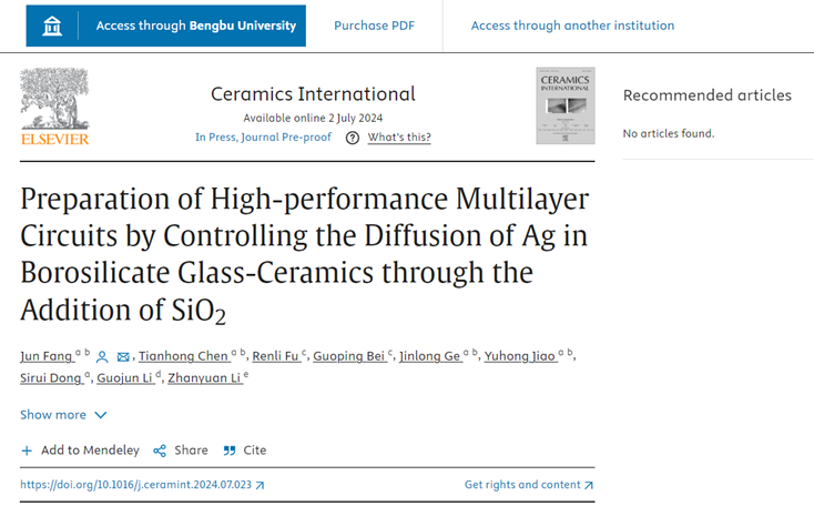 近日,材料与化学工程学院方军博士以第一作者、2026世界杯官网为第一单位发表重要成果,主要聚焦陶瓷基板表面通过调控硼硅酸盐微晶玻璃成分构筑陶瓷多层电路。相关研究成果以“Preparation of High-performance Multilayer Circuits by Controlling the Diffusion of Ag in Borosilicate Glass-Ceramics through the Addition of SiO2”为题发表在中科院材料科学:硅酸盐一区国际高水平SCI期刊Ceramics International(2024 IF 5.1,top期刊)上。