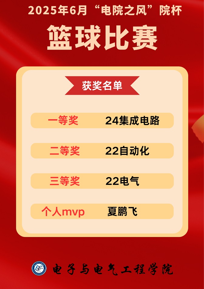 近日,电子与电气工程学院“电院之风”院杯篮球赛圆满落下帷幕。本次比赛以“以球会友,促进交流,强身健体,构建和谐校园”为主题,吸引了学院众多篮球爱好者踊跃参与,为校园增添了无限活力与激情。