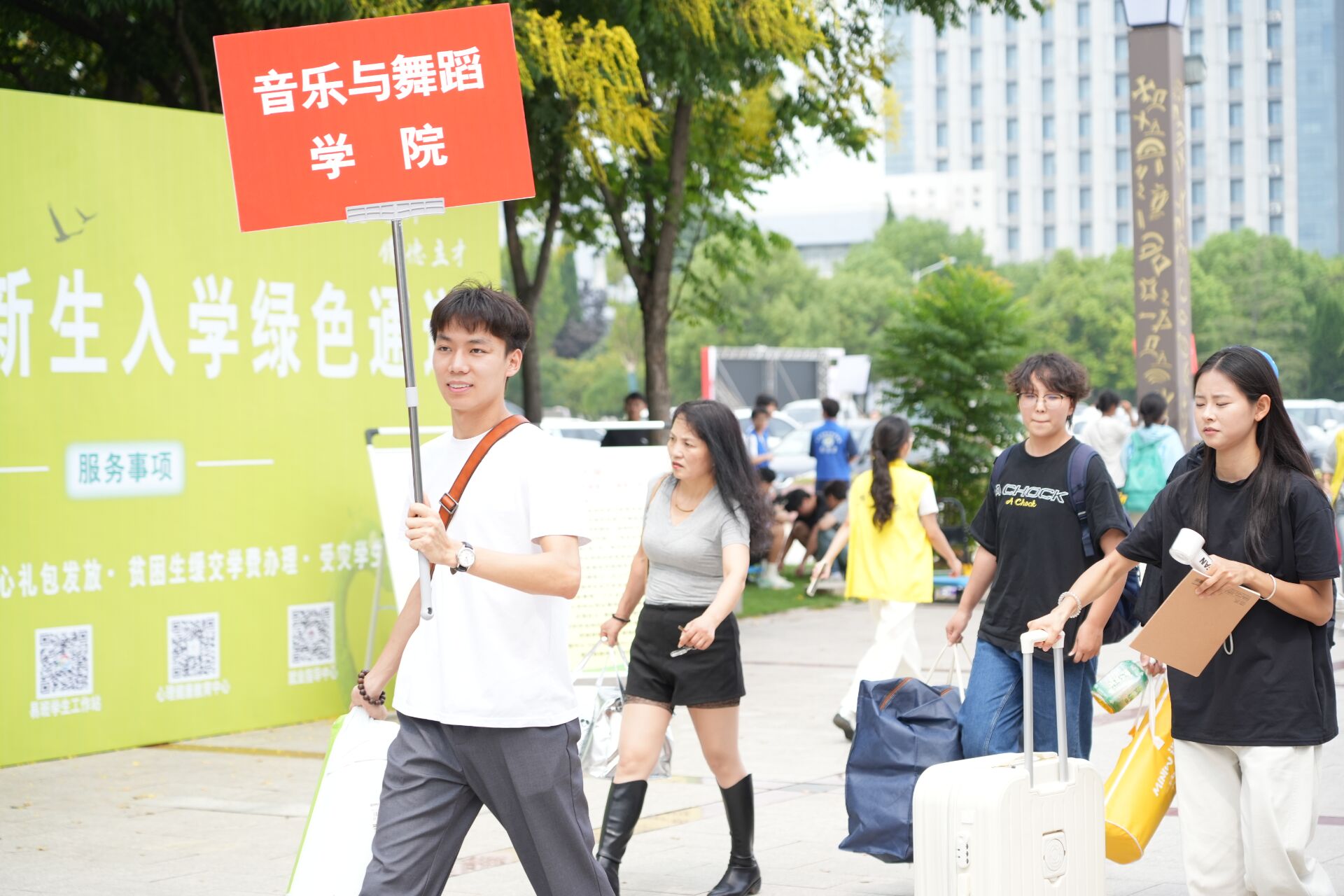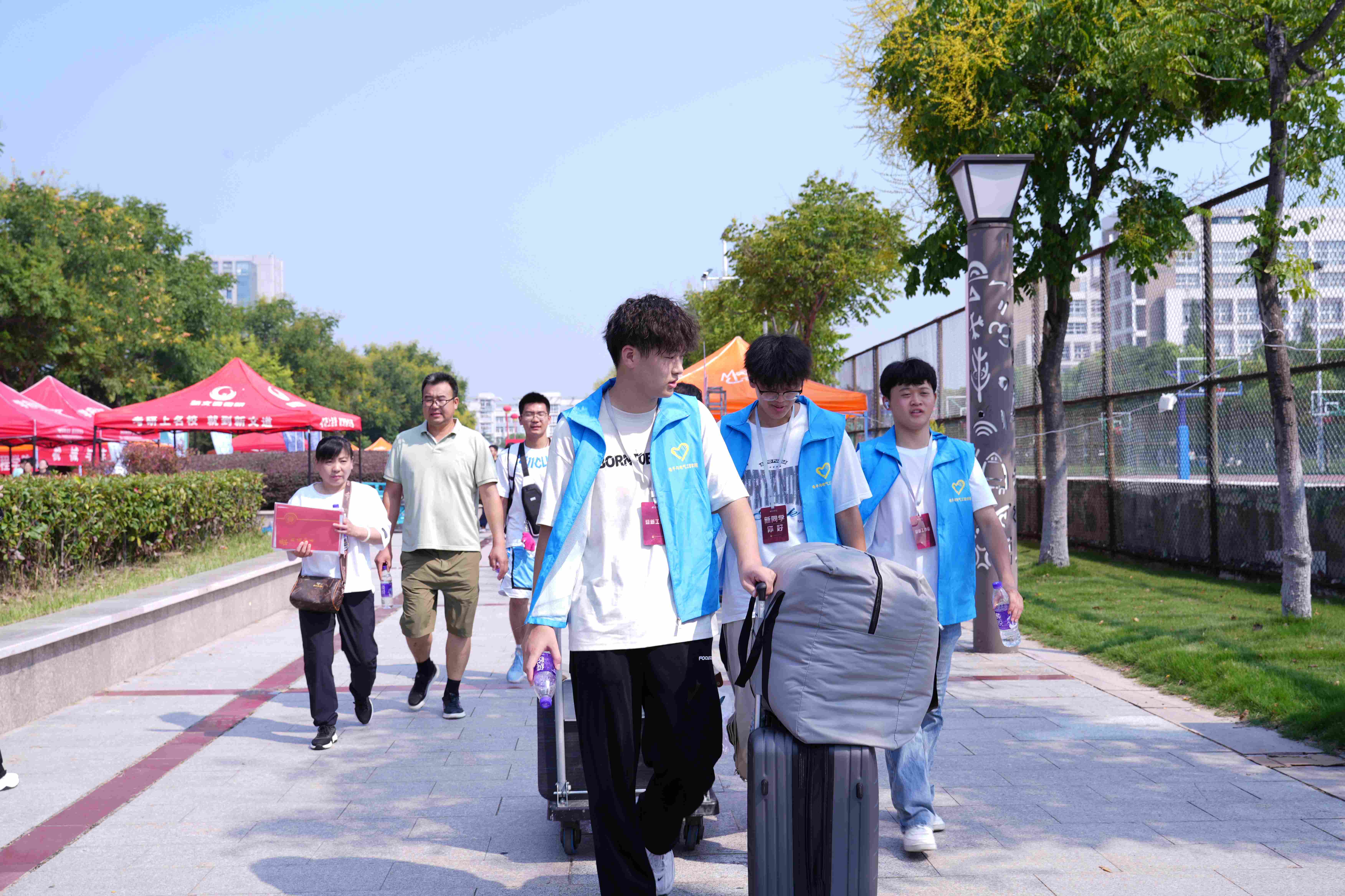 迎新现场,各岗位工作人员与志愿者组成“暖心服务队”,用行动传递温情。校门口,保卫处的老师们顶着烈日疏导车辆,耐心指引家长停放,确保入校通道畅通有序;宿舍楼内,宿管阿姨提前打扫好宿舍卫生,见到新生拎着行李进门,立刻上前帮忙整理物品,手把手教新生熟悉水电使用方法;志愿者与老师们则全程“护航”,从协助办理入学手续、搬运行李,到讲解校园布局与生活贴士,贴心服务贯穿始终。