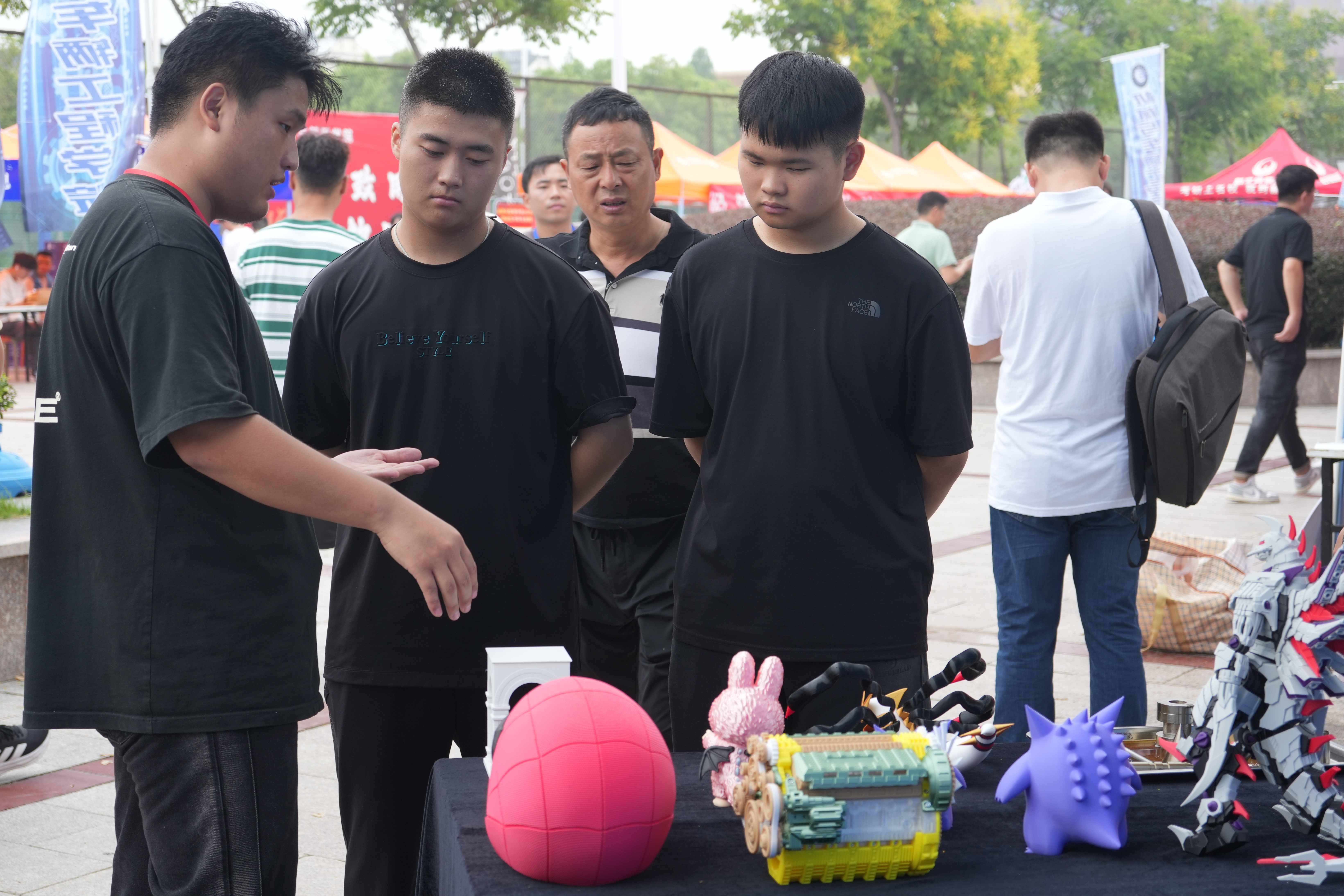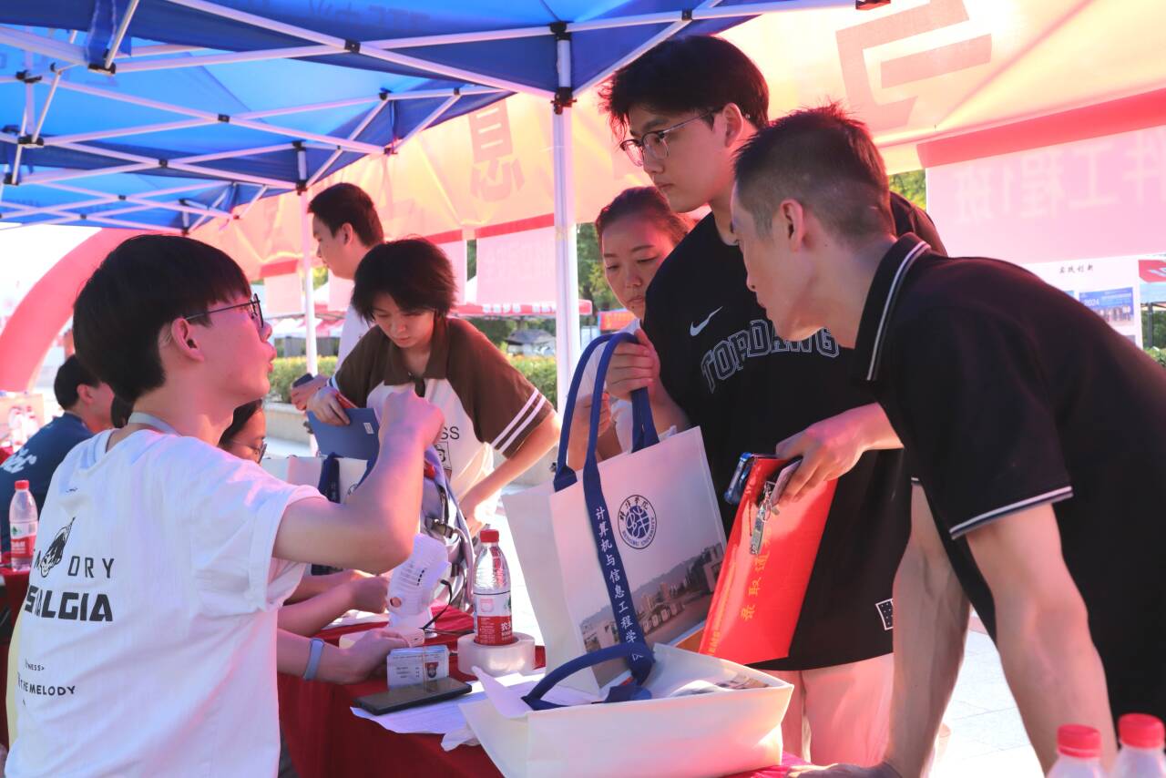 各学院结合专业特色打造的迎新展台,成了校园里的“人气打卡地”。机械与车辆工程学院展台前,两台小型3D打印机正“滋滋”运作,学生们自己打印的精致机械模型让新生直呼有趣。电子与电气工程学院用电路板造型装饰画、闪烁的电子元件模型装点展板,展现电路与电气的奇妙。食品与生物工程学院将具有学科的特色编制手串送给新生,满是温暖。计算机与信息工程学院展台被流淌代码图案的灯带环绕,搭配编程作品展示板,材料与化学工程学院的展台上有序排列着材料样本与微型化学实验装置模型,都是科技感满满。土木与水利工程学院的考研光荣榜前,学长学姐现场分享备考心得,点燃新生热情。数理学院的展台上,立体几何模型、趣味公式海报错落摆放,学术氛围浓厚。