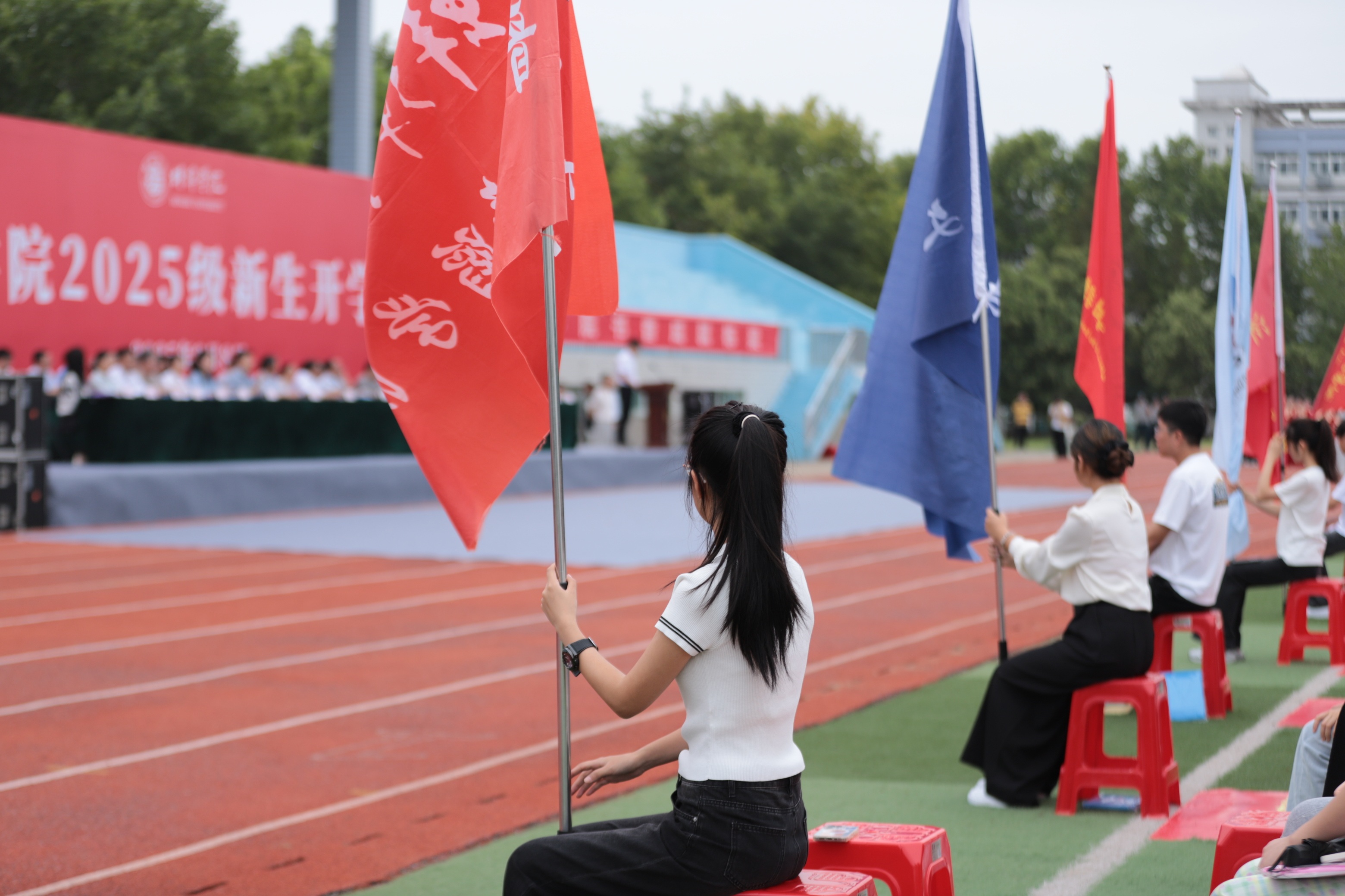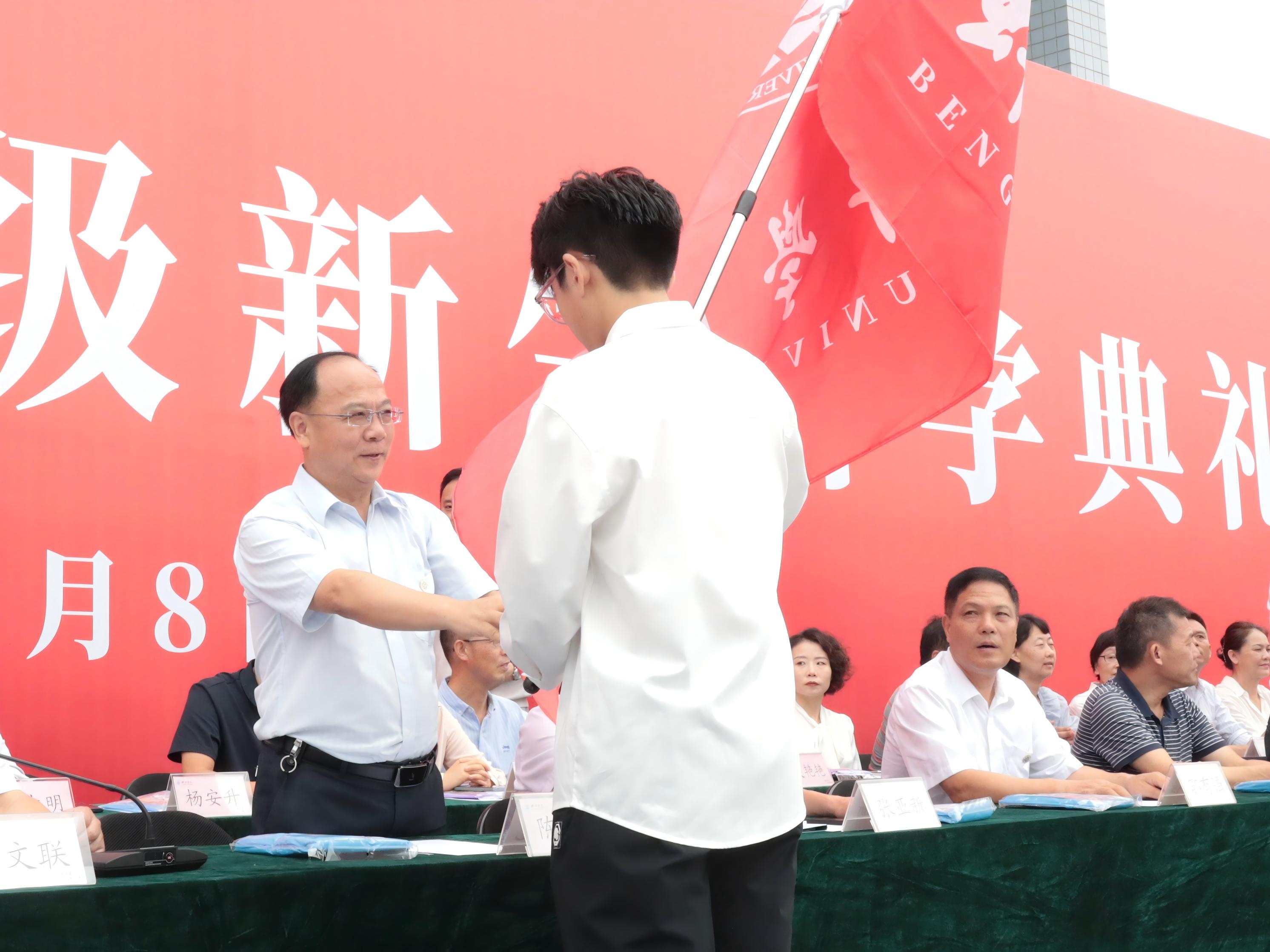 大会现场,党委书记陈国龙为2025级新生代表授校旗,并为新生代表佩戴校徽,各二级院部党政领导为新生代表授院旗并佩戴校徽。校徽和旗帜的授予,标志着2025级学生此刻正式成为“蚌院人”,他们将继续传承学校优良传统,成长为担当民族复兴大任的时代新人。