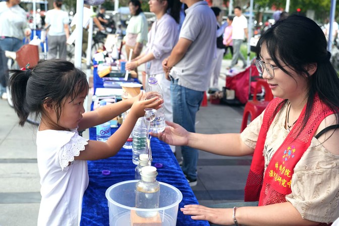 活动期间,淮河文化研究中心的展区吸引了大量市民与游客驻足。中心围绕“淮水安澜·文明传承·生态赋能”的展示思路,通过图文展板、实验体验、宣传讲解以及向来往市民发放淮河文化宣传材料等多种形式,生动展现了淮河流域悠久灿烂的历史文化、治水兴水的科技智慧以及鲜明的地域文化。