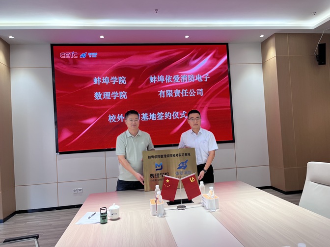为进一步推动产学研协同育人机制落地,强化应用型人才培养与产业需求的精准对接,9月10日,数理学院党委书记孙礼俊、院长黄迎辉带队赴蚌埠依爱消防电子有限责任公司,举行校外实习基地签约暨挂牌仪式。蚌埠依爱消防电子有限责任公司总经理张晓双、党总支书记黄薛梅、党建与人力资源部负责人范胜杰,及校友代表张奇等共同出席活动。