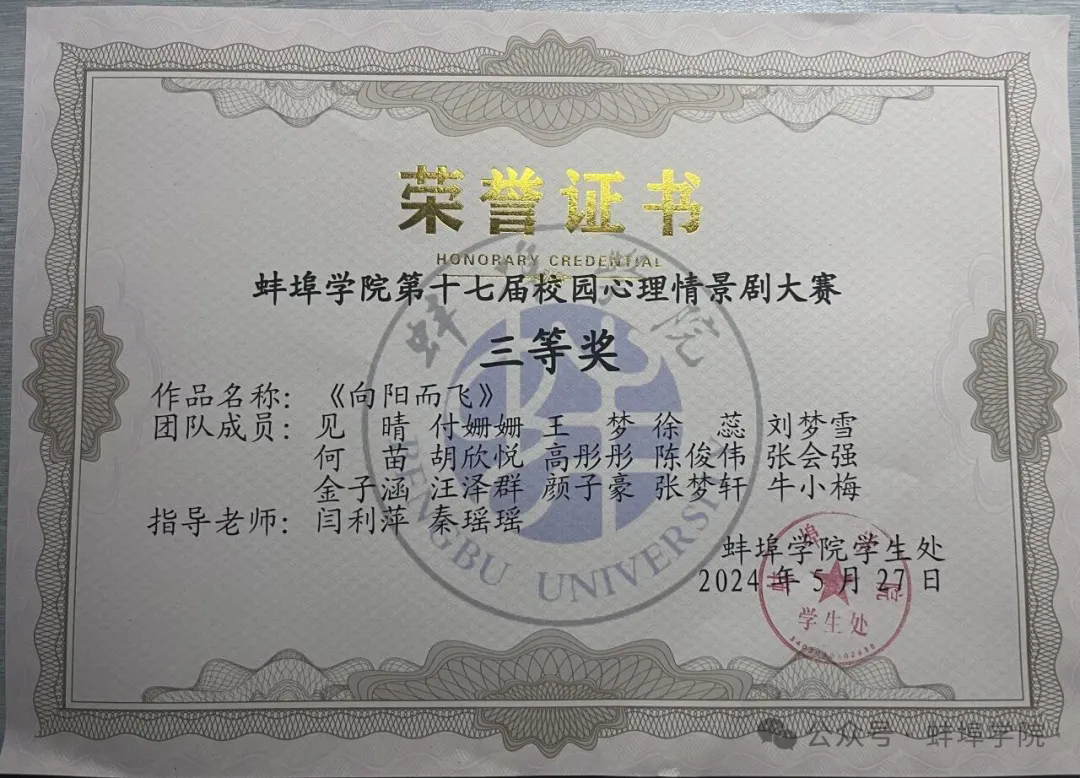 闫利萍积极配合学校心理健康教育工作,参与心理健康宣传、新生心理普查面谈、心理健康月及心理情景剧比赛指导等工作,指导学生获2024年校第十七届心理情景剧大赛三等奖。