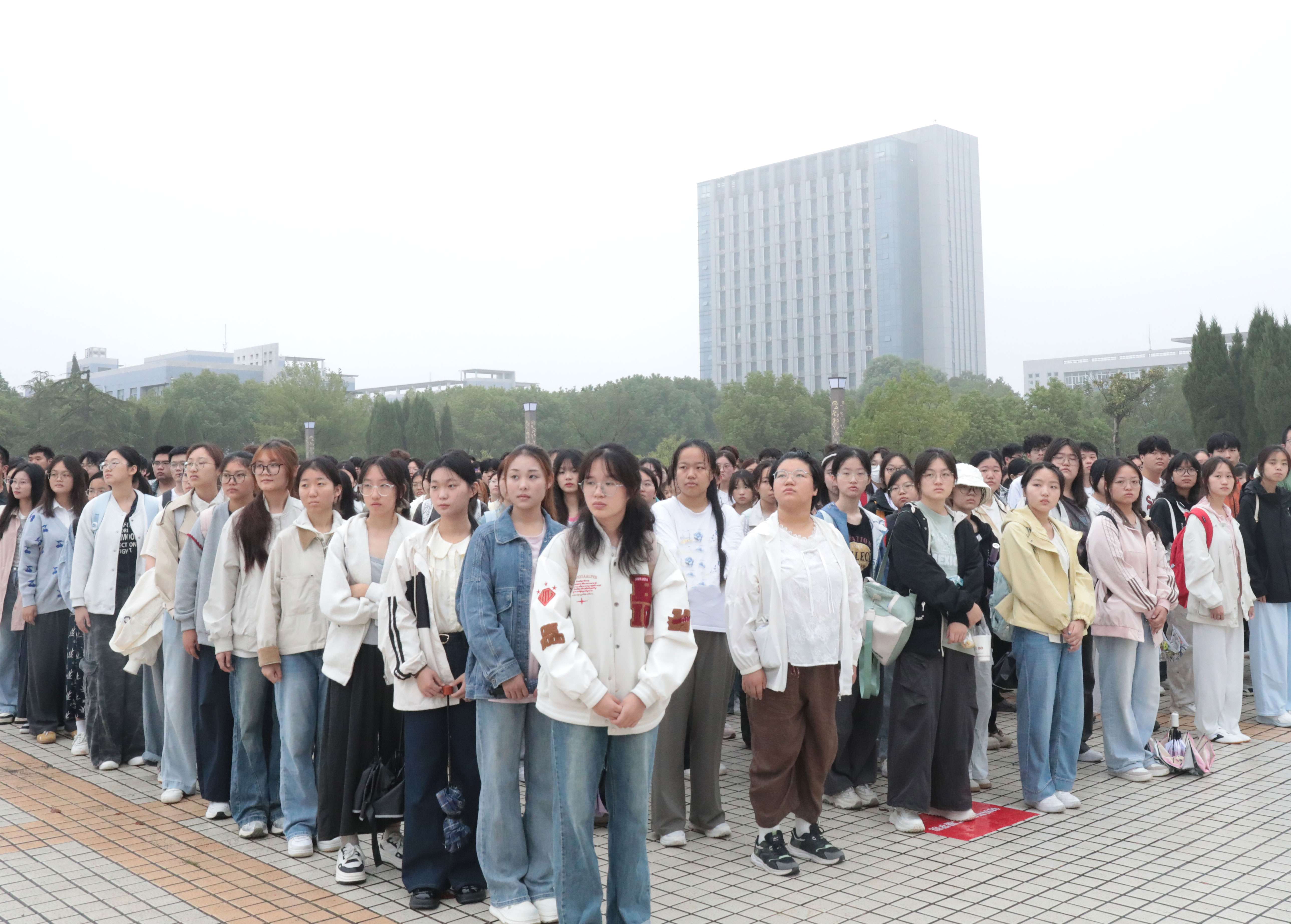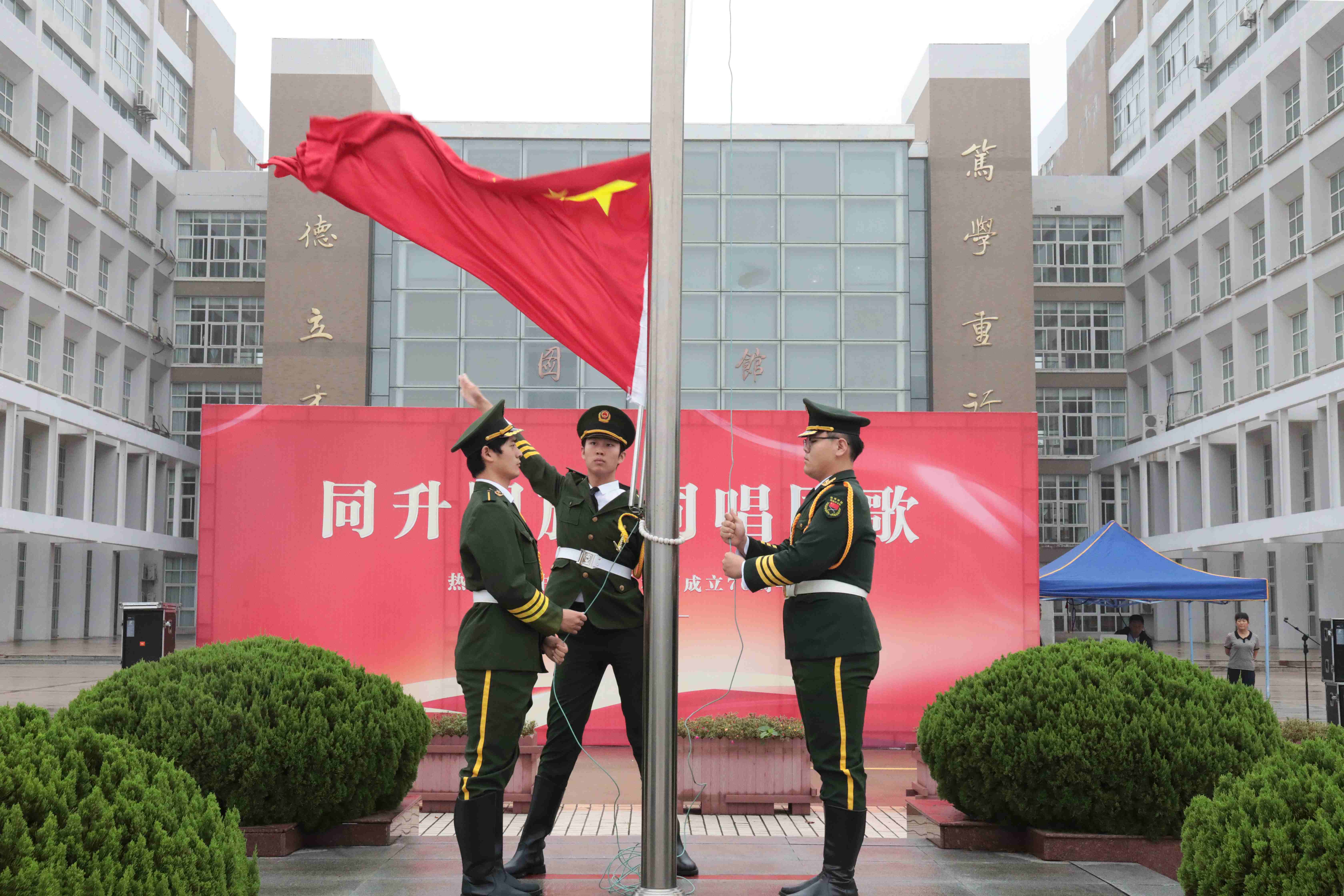 清晨的校园,金桂飘香。师生们整齐列队、肃立致敬。雄壮的《义勇军进行曲》奏响,五星红旗迎着晨光冉冉升起,全场齐声高唱国歌,目光追随着飘扬的旗帜,现场氛围庄重热烈。