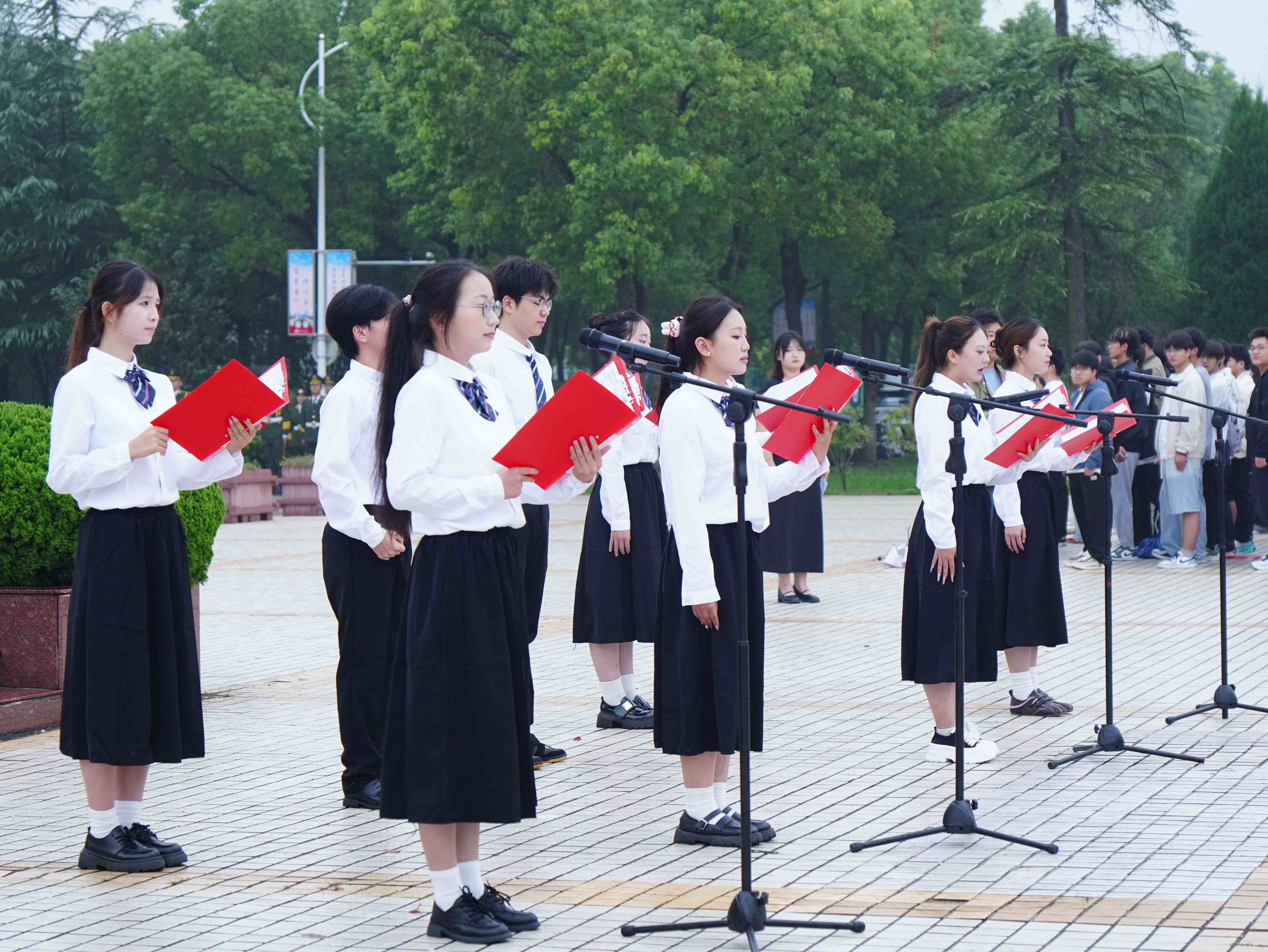 升旗仪式后,学校广播站带来诗歌朗诵《青春中华颂》。激昂的文字与饱满的情感,既生动诠释了青春与祖国的同频共振,也道出了当代大学生“续写奋斗篇章”的青春誓言,深情礼赞引发全场师生共鸣,赢得阵阵掌声。