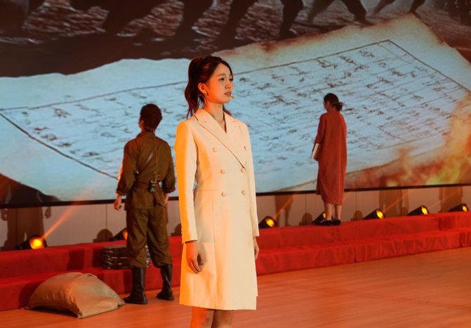 演出在热烈的氛围中拉开帷幕,节目形式丰富多样,内容深刻动人。情景朗诵《烽火家书》、《渡江第一船》带领观众重温峥嵘岁月,感受革命先辈的家国情怀;戏剧小品《开花》、《守岛英雄》以生动的演绎彰显新时代青年的责任与担当;电影配音《父母之河》、《哪吒》选段巧妙传递中华优秀传统文化薪火;《关于昨天的意见》、《倾听绿水青山的诉说》则以艺术形式呼应绿色发展理念,引发师生共鸣。最后,大合唱《复兴颂》、《歌唱祖国》以激昂的旋律、饱满的情感,表达对祖国繁荣昌盛的美好祝愿,将现场气氛推向高潮。