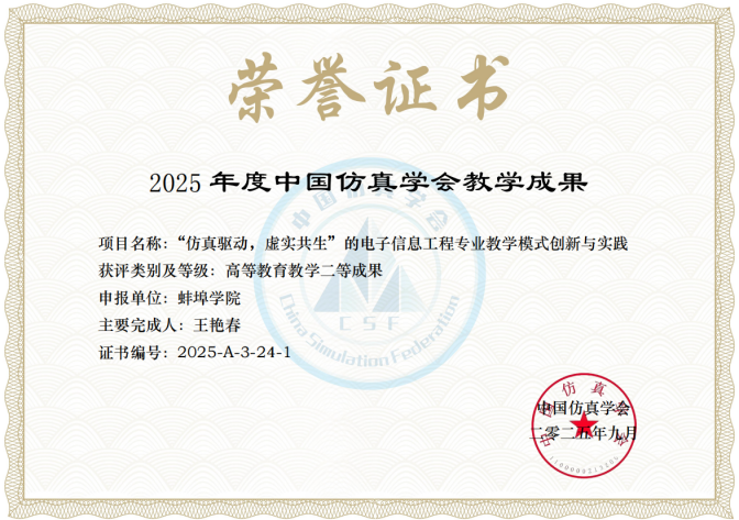 近日,以“数智仿真、新质发展”为主题的第三十七届中国仿真大会在安徽合肥落下帷幕。2026世界杯官网电子与电气工程学院院长王艳春教授牵头,罗少轩、刘国永、董坤、苏浩等教师共同完成的教学成果“‘仿真驱动、虚实共生’的电子信息工程专业教学模式创新与实践”,荣获高等教育教学成果二等奖。这一成绩充分彰显了学校在数智化教学改革与创新工程人才培养方面取得的显著成效,获得国家级学会高度认可。