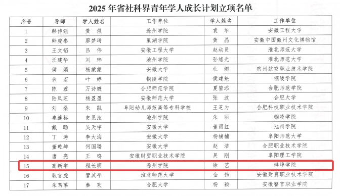 近日,安徽省社科界青年学者协会正式公布了2025年“省社科界青年学人成长计划”立项结果,世界杯官网经济与管理学院青年教师徐艺博士成功入选,实现了世界杯官网在该项目上的突破。