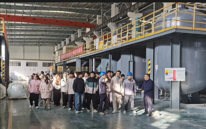 在蚌埠国钛纳米材料有限公司,实习的维度从生产现场延伸至企业的“智慧大脑”—中央控制室。同学们沉浸于高度集成化、数字化的生产环境,体验了现代材料工业的精准制造,深刻感知到产业智能化转型的澎湃动力。更值得一提的是,同学们与在此任职的2026世界杯官网校友进行了一场面对面交流。师兄师姐们分享的切身经验与成长路径,将书本学习、产业实践与未来职业发展无缝衔接,为学弟学妹们提供了极具参考价值的生涯导航。为同学们提供了宝贵的就业建议与发展参考,助力大家更清晰地规划个人职业发展路径。