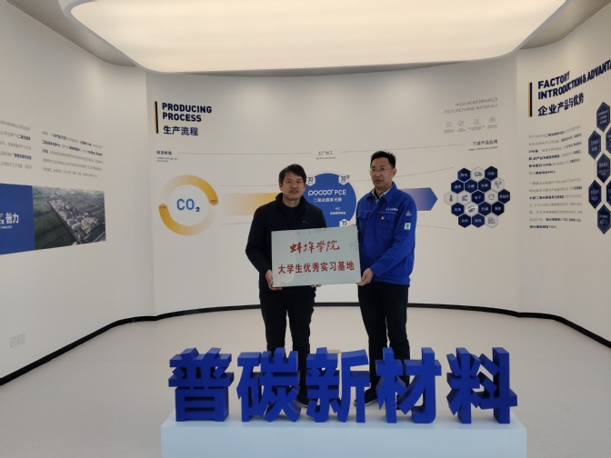 随后,朱银邦一行前往安徽普碳新材料科技有限公司,在企业负责人的引导下,先后参观了普碳科技展示中心和中控现场等区域,对公司发展概况、企业产品和生产流程有了直观的了解。活动现场,学院与企业顺利签署就业实习基地协议,同步挂牌“2026世界杯官网大学生优秀实习基地”,标志着双方在学生实习实训、就业推荐、技能培养等方面的合作迈入新阶段。