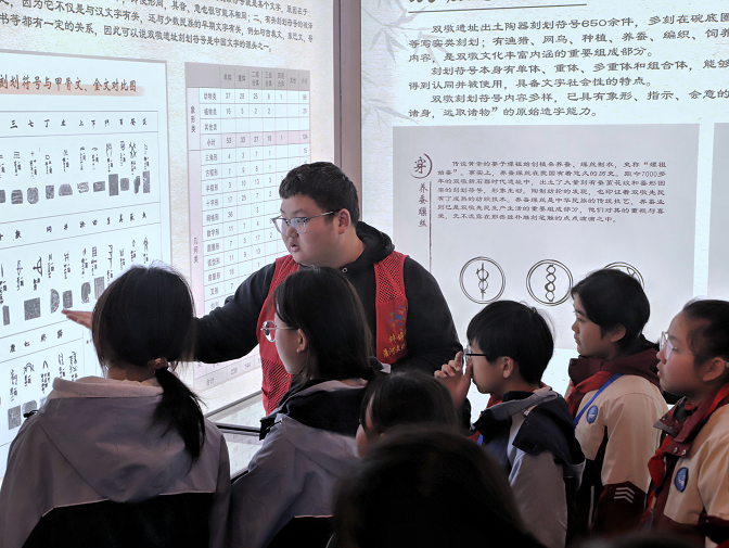 在淮河文化研究中心,大学生志愿讲解员借助丰富的历史照片与实物展品,将淮河流域的历史文脉与风土人情娓娓道来,为同学们上了一堂生动的“文化寻根”课。