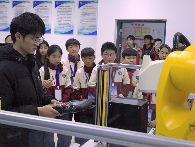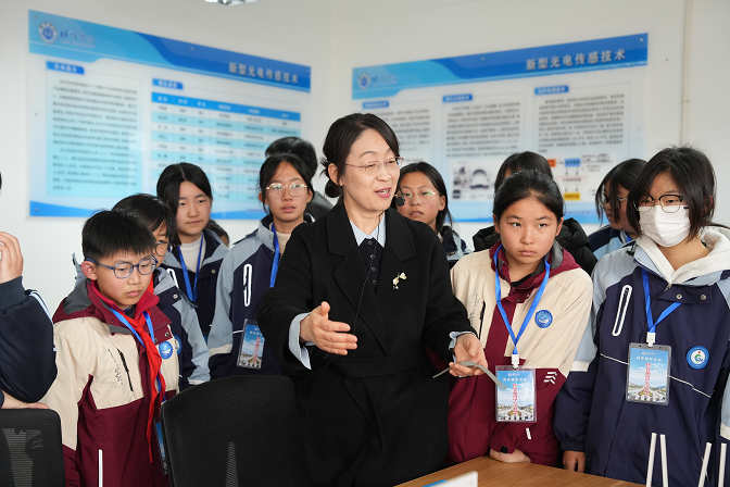 在安徽省智能感知与控制工程研究中心,王艳春为同学们介绍智能传感器、工业机器人等前沿设备,引发了阵阵惊叹与踊跃提问。同学们围绕在设备旁,认真观察跳动的数据,不时发问,眼神中充满好奇。