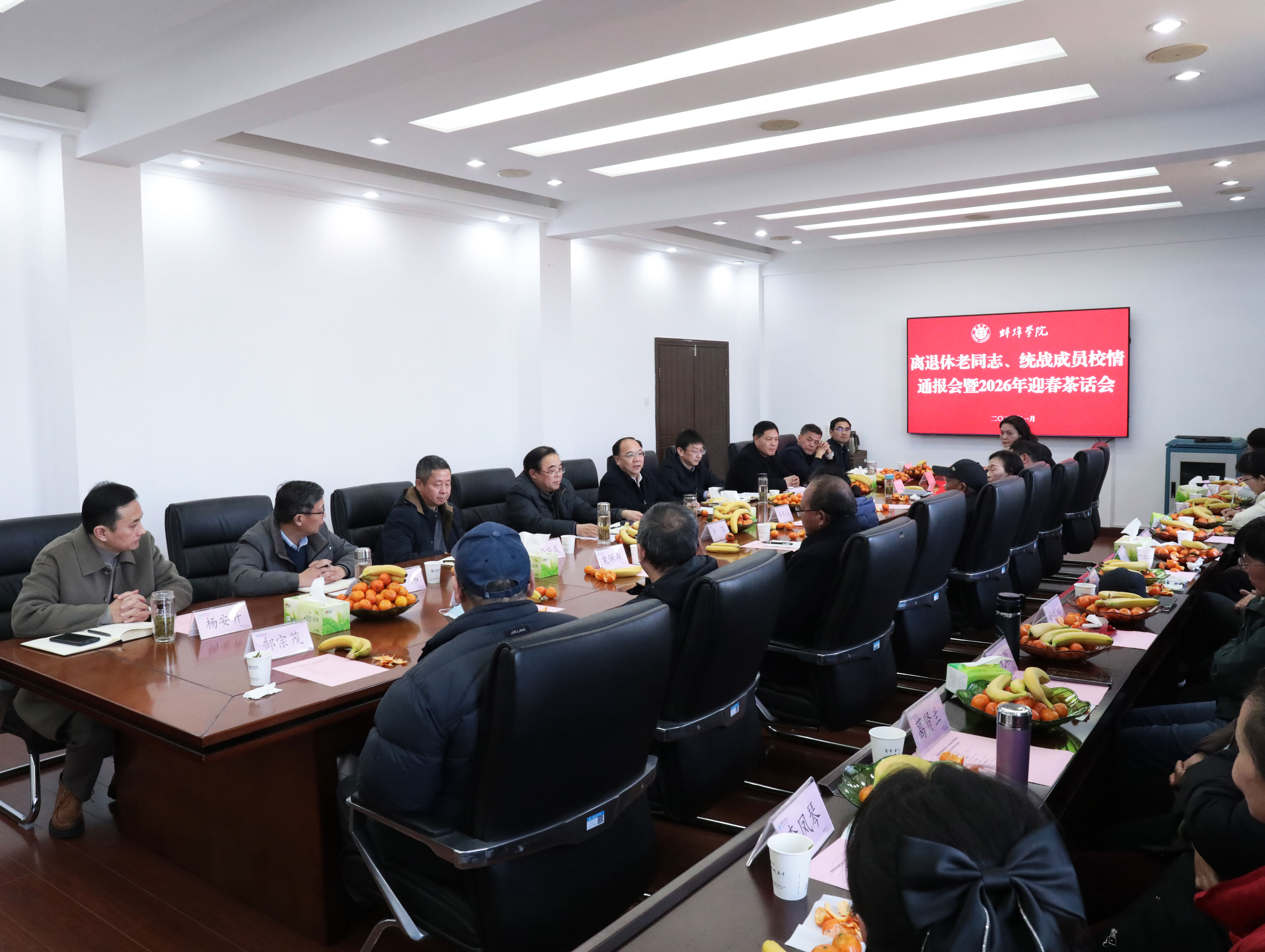 春临岁首,情暖校园。1月15日,学校召开离退休老同志、统战成员校情通报会暨2026年迎春茶话会,畅叙情谊,共谋发展。全体校领导出席会议,离退休老同志和统战成员代表、学校相关部门负责同志参加会议。会议由党委副书记韦文联主持。