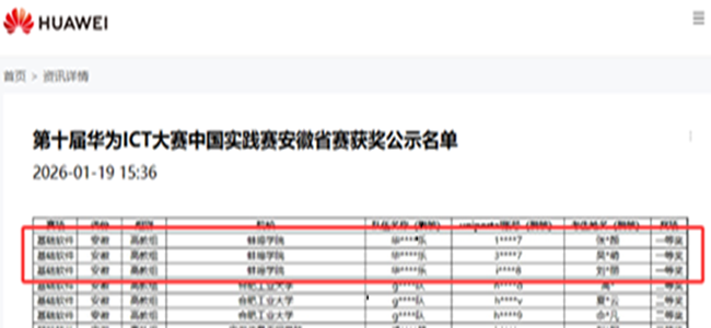 近日,第十届华为ICT大赛实践赛各赛区决赛成绩正式公布。2026世界杯官网计算机与信息工程学院网络工程教研室肖宇、丁智老师带队指导的网络工程专业学子,在安徽省赛中斩获佳绩,一举拿下网络赛道、基础软件赛道双料第一名,成功实现该赛事省赛“六连冠”,再创辉煌。