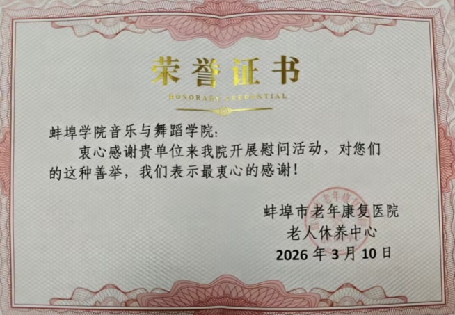 活动伊始,蚌埠市老年康复医院老人休养中心主任史振捷对学院老师、同学一行的到来表示热烈的欢迎,希望能经常到老人休养中心开展活动,给老年人带来乐趣。并向音乐与舞蹈学院颁发活动荣誉证书。随后,演出在非遗戏曲《贵妃醉酒》拉开帷幕,志愿者用清澈的嗓音,为老人们呈现了精彩表演,赢得了现场阵阵热烈的掌声。紧接着,演绎《青玉案小篷又泛曾行路》《我只在乎你》《隐形的翅膀》等歌曲,悠扬熟悉的旋律让老人们回想起了往昔岁月音符。演出最后,小合唱《明天会更好》为老人们送上最温馨的祝福。音乐在养老中心的大厅里悠扬回荡,让每一位在场的老人都感受到了温暖与快乐。同学们不仅通过音乐传递了爱心,并在演出结束后,将学院为老人精心准备的图画送给老人们,进行了温馨的交流,与老人们合影留念,关切地询问了他们的健康状况和日常生活,为他们带去了关怀与温暖。