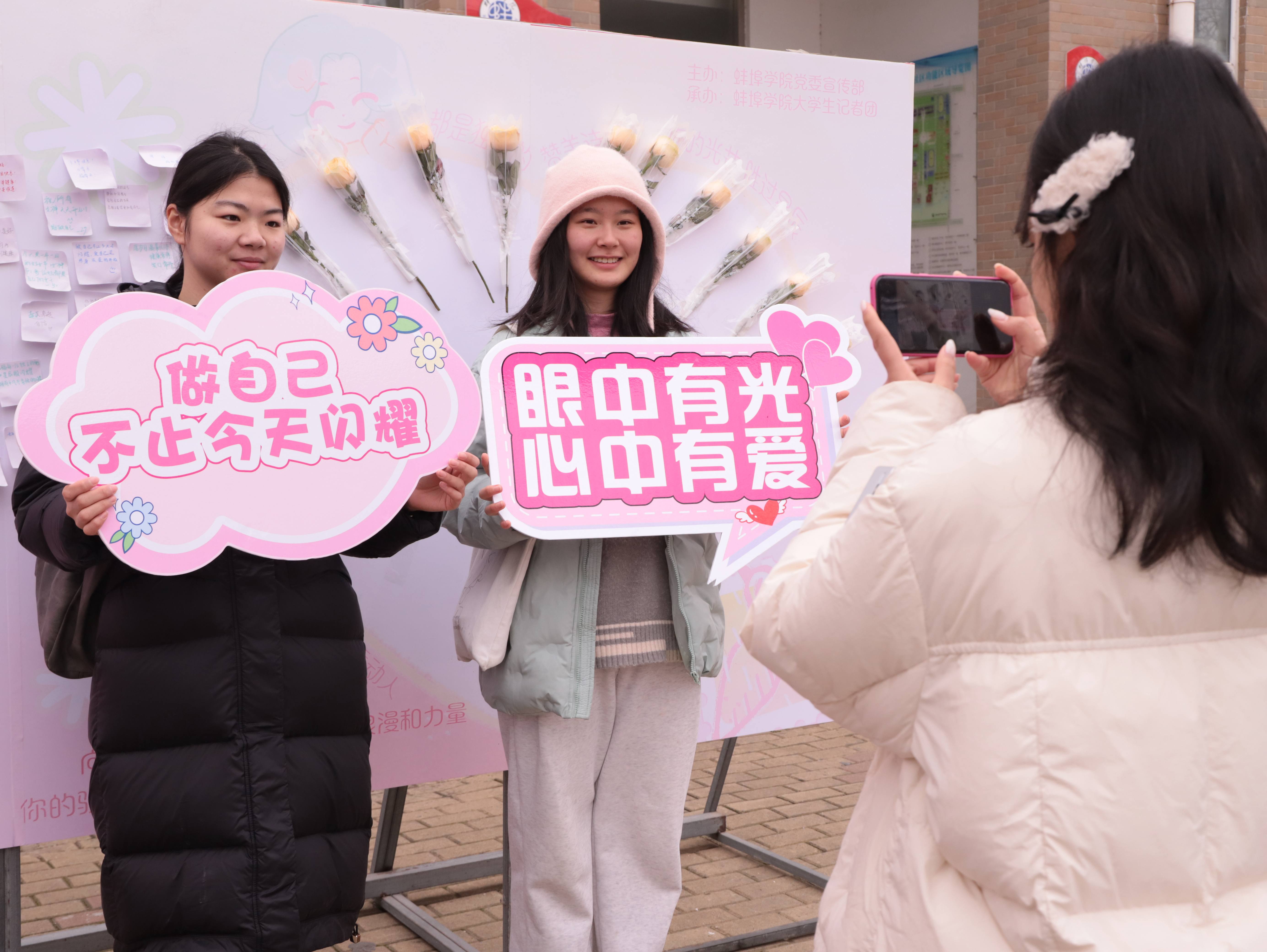 活动现场布置了妇女节主题的拍照背景墙,搭配定制手持小立牌,成为校园里一道温馨的风景线。在“打卡留影・定格美好瞬间”环节,参与者们手持精美立牌,在背景墙前定格专属节日瞬间,完成打卡后,获得专属自己的现场免费打印照片1张和精美文创礼品一份。那一张张笑脸在镜头中绽放,是定格在春日里的美好与温暖。