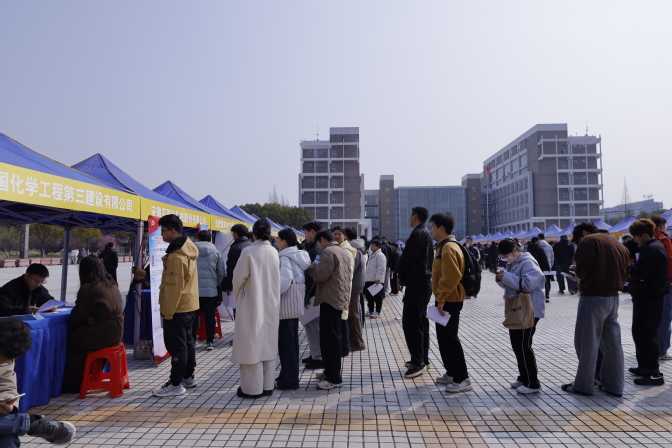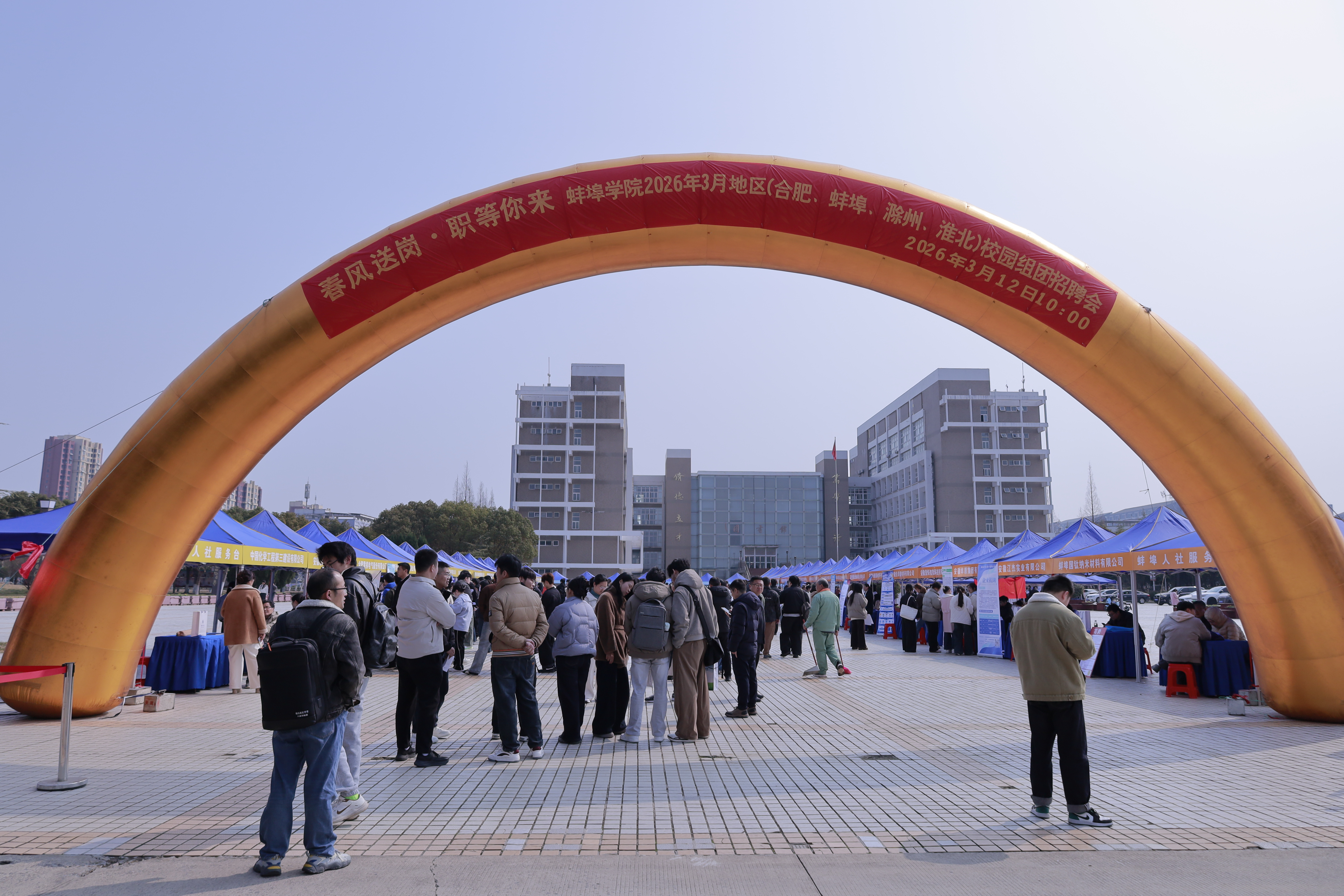 3月12日上午,学校在图书馆西侧广场开展合肥市、蚌埠市、滁州市、淮北市四市组团招聘会。本次招聘会共有76家企业进校选聘毕业生,提供岗位2500余个。四市人社部门相关负责同志,学校党委学生工作部负责同志、各二级学院党政负责同志,全体毕业班辅导员以及2026届毕业生参会。