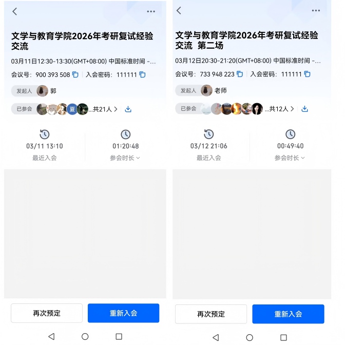 为帮助学院2026届考研过线学生增强备考信心,提升复试能力,提高考研上岸成功率。3月11日中午和3月12日晚上,文学与教育学院通过线上和线下结合的方式举办了两场考研复试经验交流会。此次会议由辅导员郭天梅主持。