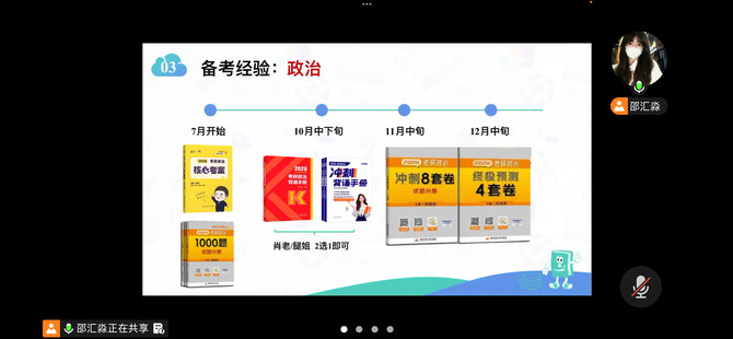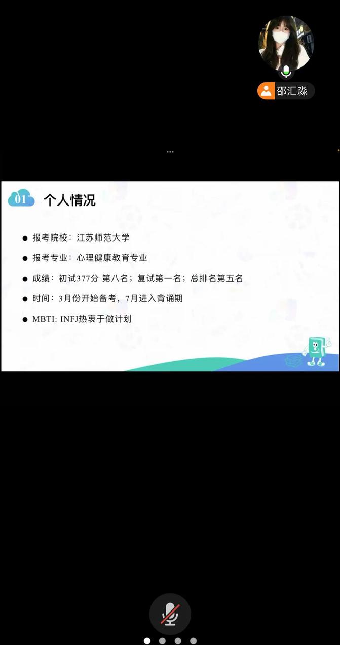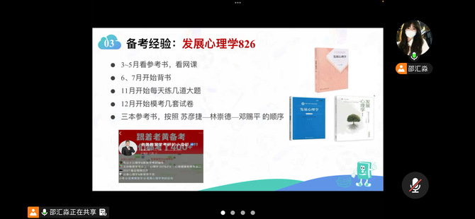 邵汇淼现就读于江苏师范大学的心理健康教育专业。分享环节,邵汇淼首先结合自身考研实战经历,从心理学考研择校定位、科目备考策略、时间规划、心态管理、复试与调剂要点等方面展开细致讲解。其次,针对外语专业同学跨考心理学的痛点与优势,学姐系统梳理了专业课核心考点、参考书单与复习节奏,分享了英语科目提分技巧与背诵记忆方法,并用真实案例拆解备考误区,给出可落地的学习计划与时间管理建议。最后,她鼓励同学们明确目标、坚持自律、保持心态平稳,以科学方法与持久毅力应对考研挑战。