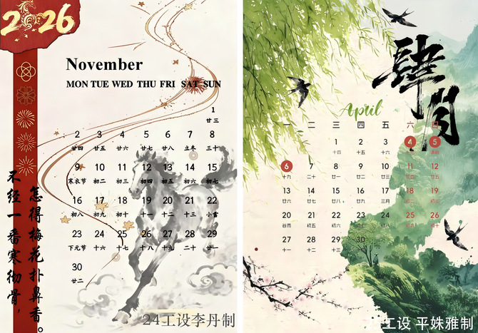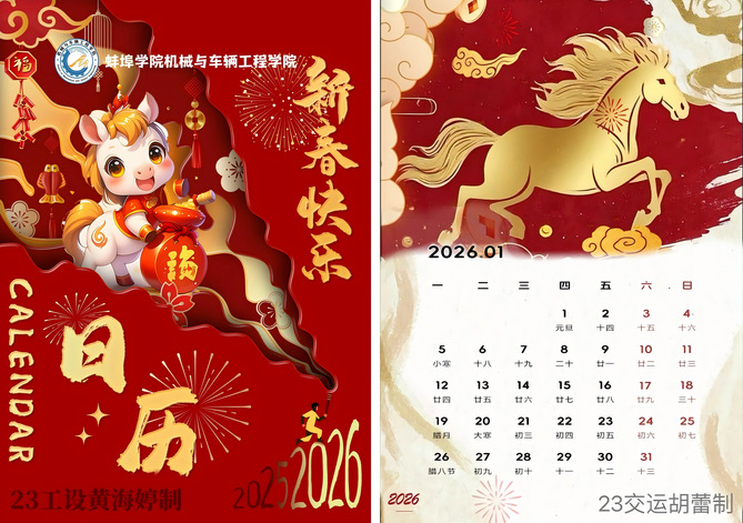 经过专业评审与优化打磨,一批优秀作品脱颖而出,成为本次文创日历的核心内容。这些作品以月份为单位,将传统美学与现代设计巧妙结合,每一页都承载着独特的文化记忆与青春气息,彰显了机械与车辆工程学院学子的创造力与正能量。