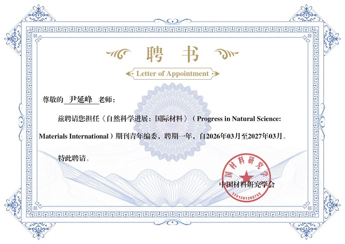 在学术服务方面,经中国材料研究学会严格遴选,尹延峰于2026年3月正式受聘为《自然科学进展:材料国际》(ProgressinNaturalScience:MaterialsInternational)期刊青年编委,聘期一年。该期刊是材料科学领域具有重要国际影响力的学术平台,2025年最新影响因子7.1,位列中国科学院二区、JCRQ2区。此次受聘既是对尹延峰学术水平与科研实力的高度肯定,也进一步提升了世界杯官网在电子信息及材料交叉学科领域的国际学术知名度。