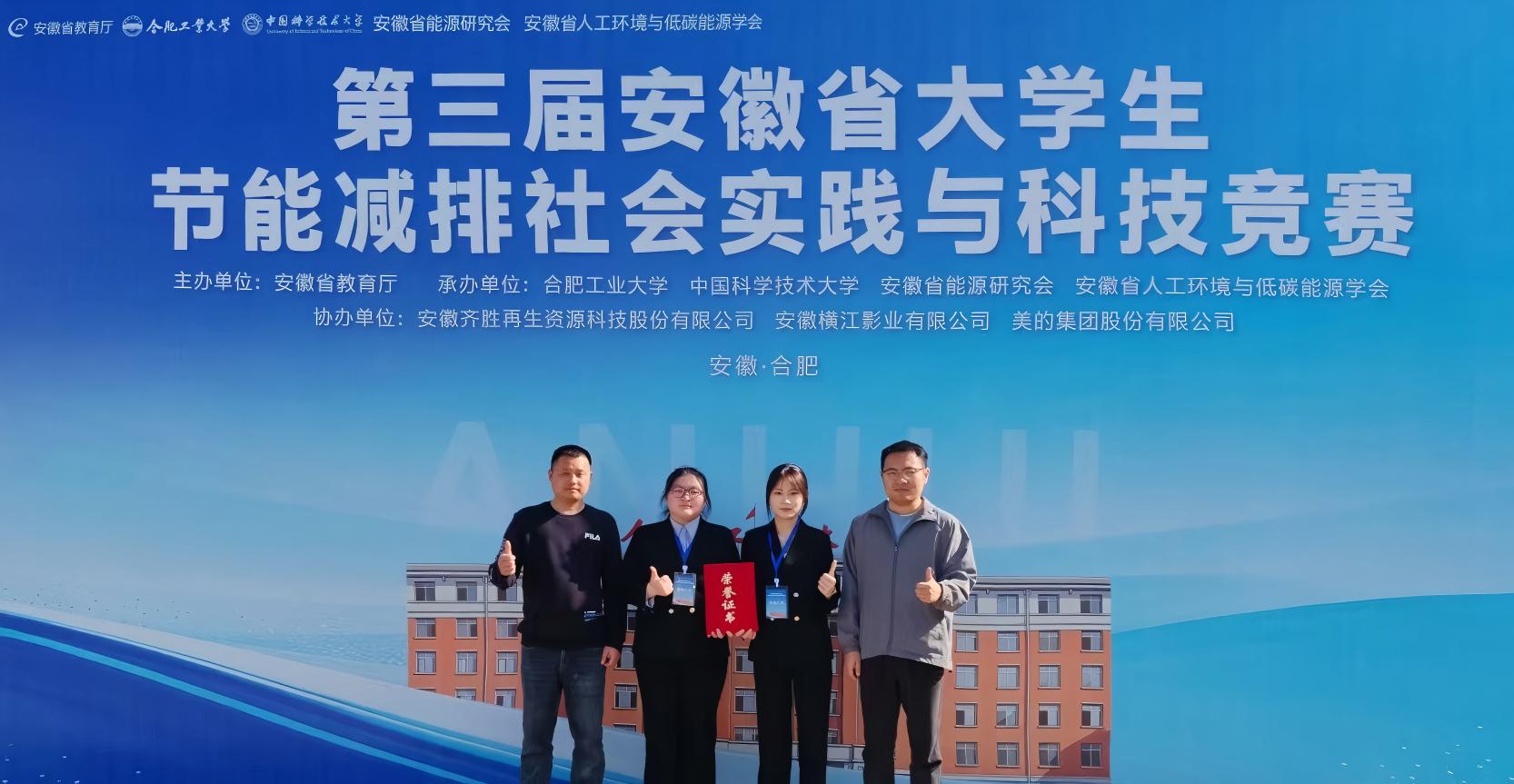 4月19日,第三届安徽省大学生节能减排社会实践与科技竞赛决赛在合肥工业大学圆满落幕。材料与化学工程学院高分子材料与工程专业武雪倩、董晨越、赵思雨、方瑜、林雨涵、张冬、鲍传明七位同学组成的参赛团队,凭借作品《“绿源净氟”——蛋白质基功能材料高效锚定水中氟离子》(指导老师:杨庆敏、秦韬)荣获省一等奖。