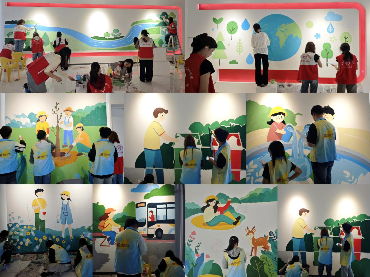 鲜艳的色彩为单调墙面注入生机,生动的画面吸引众多家长与小朋友驻足围观。小朋友们围着墙绘发出阵阵惊叹,家长们纷纷拿出手机记录,对师生们的创作连连称赞:“这些画不仅好看,还教会孩子要爱护环境,太有意义了!”创作完成后,参与活动的学生纷纷分享感悟:“亲手把环保理念画出来,既提升了专业技能,又真切感受到生态保护的重要性,更明白了‘助人’的责任与意义。”