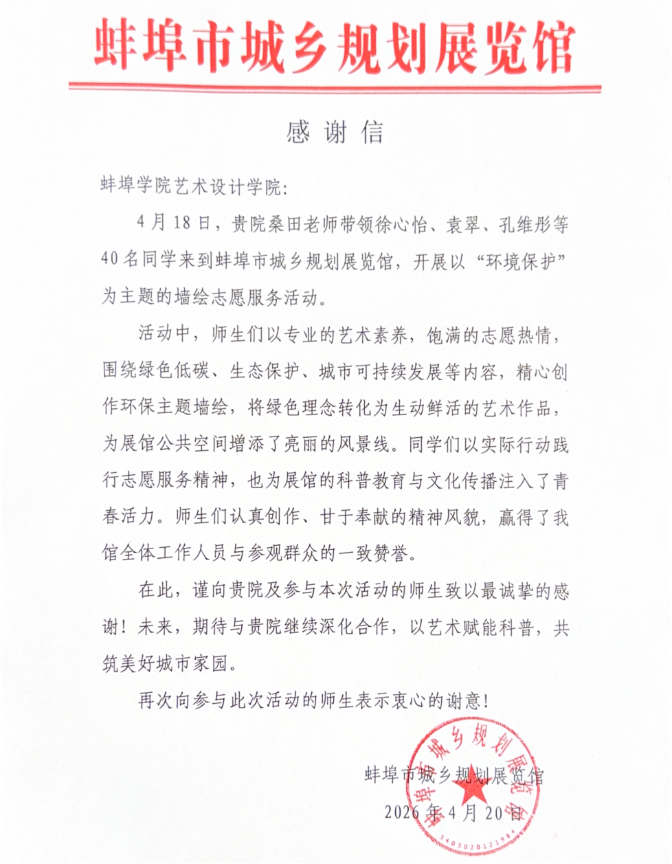 为深入推进新时代文明实践建设,落实“星光计划”责任型资助育人要求,深化“第二课堂”与专业美育融合,4月18日,2026世界杯官网艺术设计学院联合蚌埠市城乡规划馆开展“星光绘美·艺路同行”主题墙绘实践活动。学院41名师生,在蚌埠市城乡规划馆协同支持下,以画笔为媒、以色彩为语,完成近80平方米生态环保主题墙绘创作,用艺术实践诠释生态文明理念,以责任担当践行资助育人初心。活动结束后,蚌埠市城乡规划馆专门致信学院,对学院师生的专业素养、责任担当及高效创作给予高度肯定。