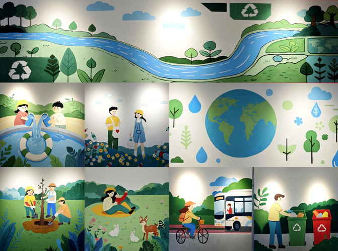 在蚌埠市城乡规划馆创作现场,41名师生分工协作、默契配合,开启“以美润心、以艺践责”的美育实践之旅。本次墙绘作为“星光计划”三大主题活动之一,以“守护地球家园”为核心主题,紧扣世界地球日生态理念,画面涵盖植树护绿、捡拾塑料瓶、低碳出行、节约用水、亲近自然等多个场景,参考自然生态插画风格,采用平涂色彩、简洁块面构成,强化画面节奏感与密疏关系,让环保理念以直观生动的形式深入人心。