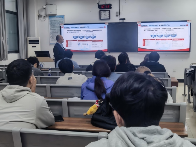 为促进2026届毕业生更充分、更高质量就业,深化校企合作与人才对接,2025年11月7日上午9:40,经济与管理学院在G103教室成功举办了海螺水泥专场招聘宣讲会。本次宣讲会吸引了经济与管理学院众多2026届毕业生踊跃参与,现场气氛热烈。宣讲会开始前,经济与管理学院党委书记赵睿、副书记夏晓燕与海螺水泥企业代表一行在友好融洽的氛围中进行了亲切会谈。学院领导对海螺水泥上海区域销售总监王亚飞、人力总监王勤、宿州海螺销售总监赵创谋一行的到来表示热烈欢迎,并简要介绍了学院的发展历程、专业特色、人才培养成果以及2026届毕业生的基本情况。双方就当前经济环境下的人才需求、校企协同育人、实习实践基地建设等议题进行了深入交流,共同表达了进一步加强合作、实现互利共赢的意愿。宣讲会由海螺水泥上海区域人力总监王勤主讲。王勤总监首先通过一段精彩的企业宣传片,向在场同学生动展示了海螺水泥作为世界500强企业和中国建材行业领军者的雄厚实力、辉煌发展历程以及全球化战略布局。随后,他围绕企业文化、发展前景、人才理念、招聘岗位需求、薪酬福利体系、员工职业发展通道等方面进行了全面而细致的介绍。他特别强调,海螺水泥高度重视青