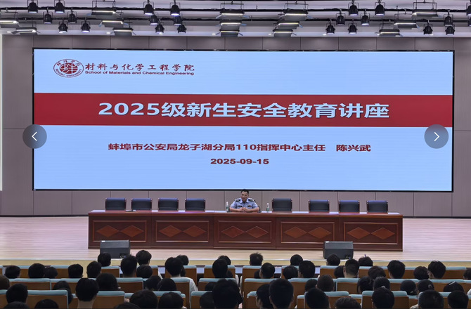 为增强2025级新生的安全意识,全面提升新同学的安全防范技能,9月15日晚,材料与化学工程学院在学术报告厅成功举办了2025级新生安全教育专题讲座。讲座特邀蚌埠市公安局龙子湖分局110指挥中心主任陈兴武、龙子湖分局法制大队王之高警官作为主讲,学院党委书记张敏、党委副书记朱银邦、新生辅导员及2025级新生参加。陈兴武结合大学校园发生的真实案例,强调了安全教育的重要性和必要性,系统性地剖析了大学生在交通、网络、心理、财产等方面面临的安全隐患及防范策略,揭秘诈骗分子“满满的套路”,告诫同学们不要抱任何侥幸心理,切勿贪小便宜,增强反诈意识,提高反诈能力;同时他还通报了校园安全危机事件,加强了生命安全教育,要求新生重视心理健康教育等。最后,他希望班级班长、寝室长等学生干部提高责任担当意识,加强与警方建立联系通道,做好同学人身安全预警。王之高从网络交友到电信诈骗,从犯罪预防到抵制邪教,他以大学生鲜活的案例切入,深刻剖析最新诈骗手法,帮助学生筑牢防骗“防火墙”。此次讲座不仅强化了师生的安全意识与防范能力,还进一步促进了警校之间的紧密合作与沟通。今后,将不断探索创新安全教育模式,为创建更加美好的平安校