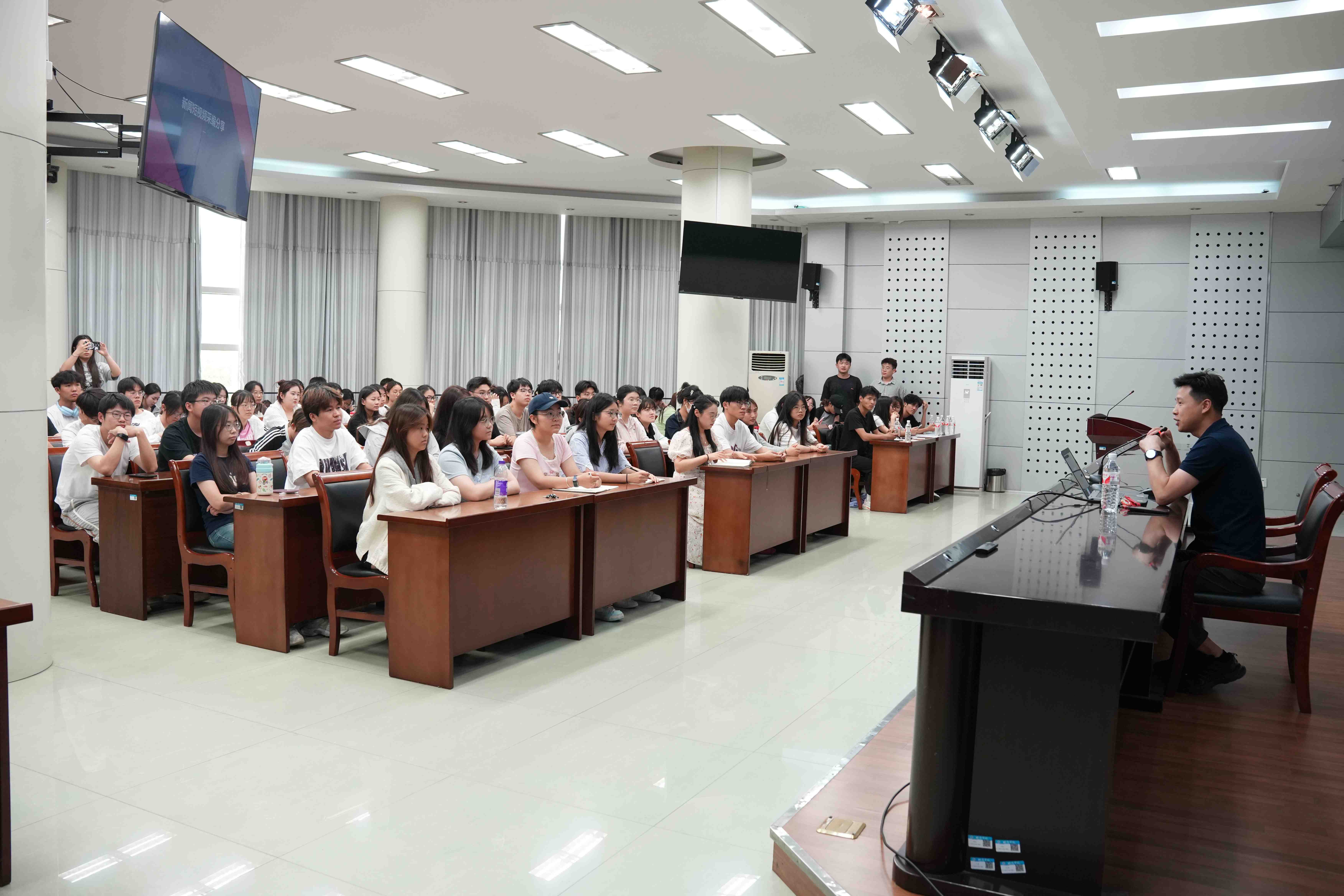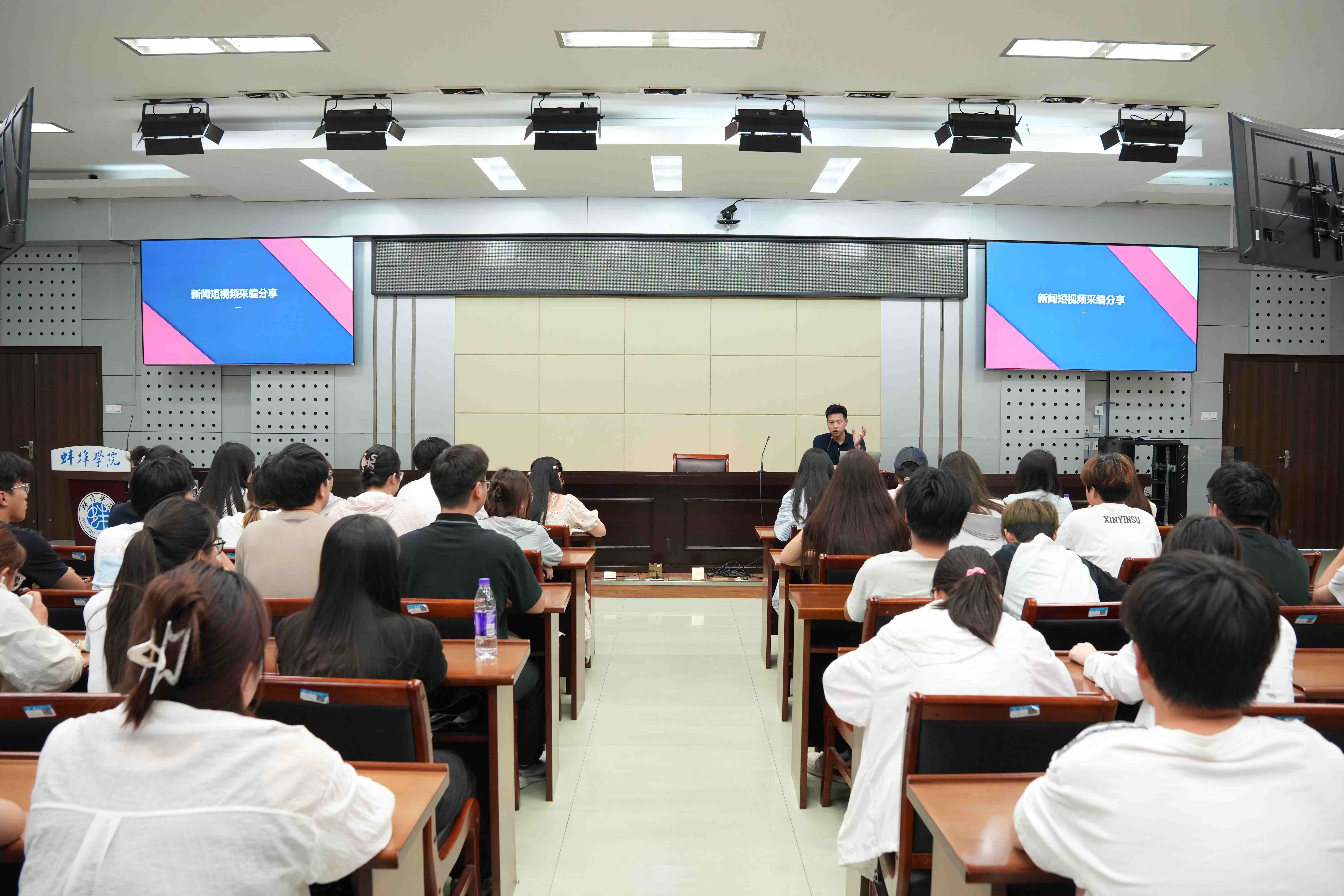 讲座中,李博结合蚌埠日报新媒体运营、短视频采编的实战经验,带来了短视频创作的“独家秘籍”,他介绍了短视频拍摄的四大基本要求及多种实用技巧,并结合案例为同学们介绍了视频采编“基础款”“进阶款”“爆款”等不同的特点及创作要领。