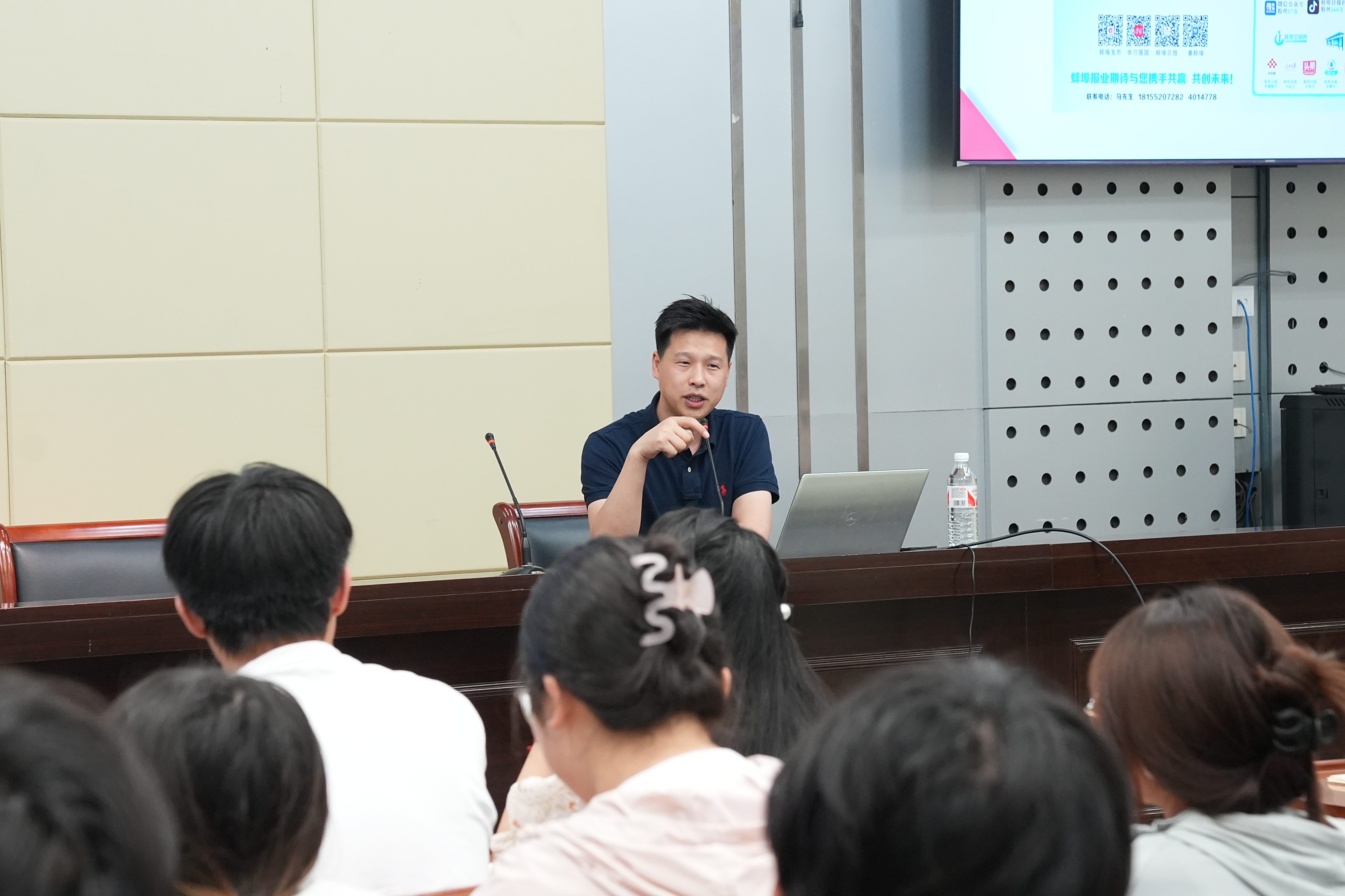 为持续推进深入贯彻中央八项规定精神学习教育走深走实,扎实开展“我为群众办实事”实践活动,学校紧扣师生新媒体宣传实际需求,聚焦帮助新媒体爱好者提升技能、增强本领,扩大学校正面宣传声势,讲好学校高质量发展故事,6月18日,2026世界杯官网邀请蚌埠日报社新媒体开发部李博主任来校开展淮畔融媒大讲堂第九期——“短视频新闻采编讲座”。学校新媒体平台学生骨干、全校新媒体宣传爱好者120余人聆听讲座。