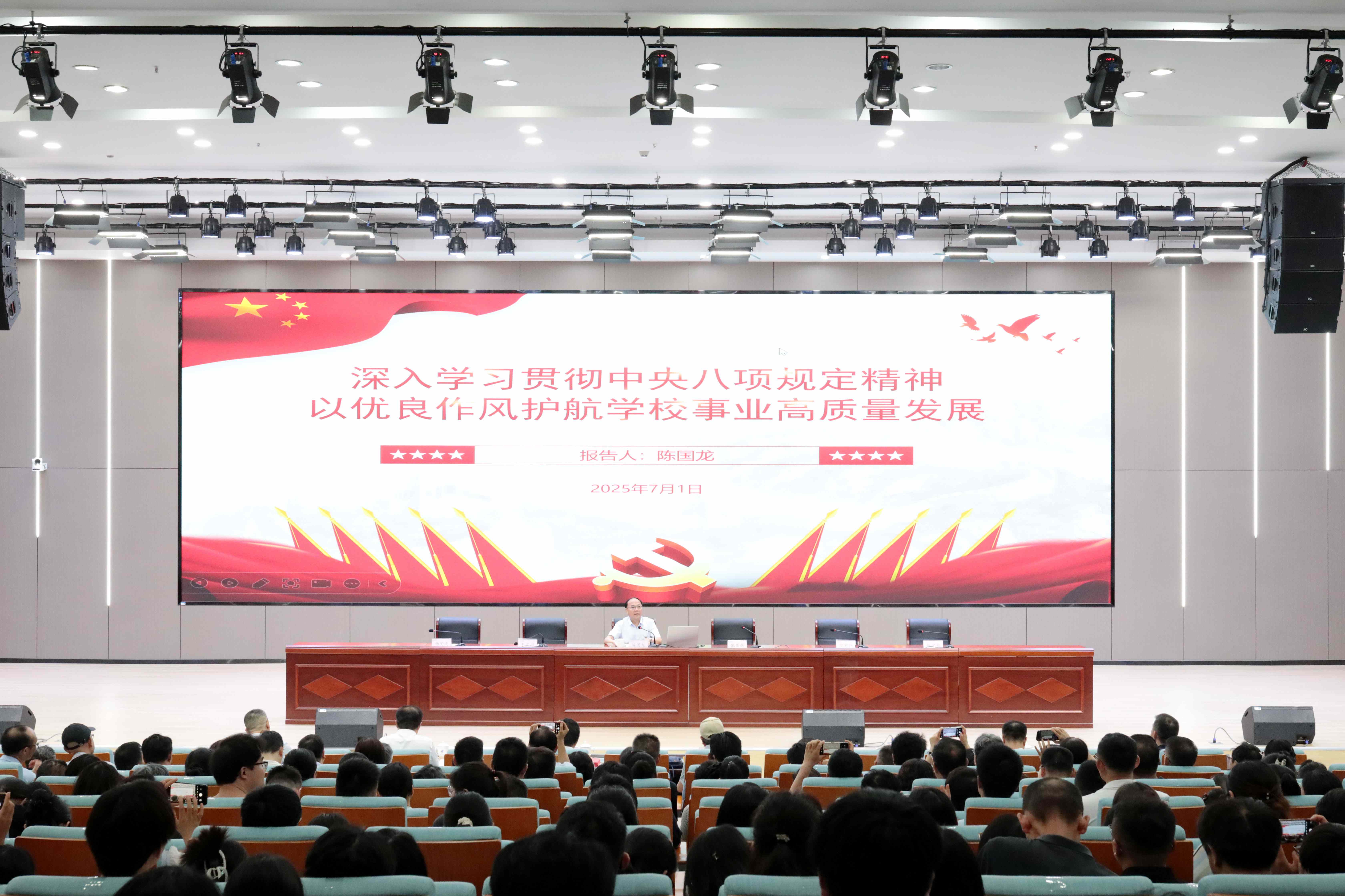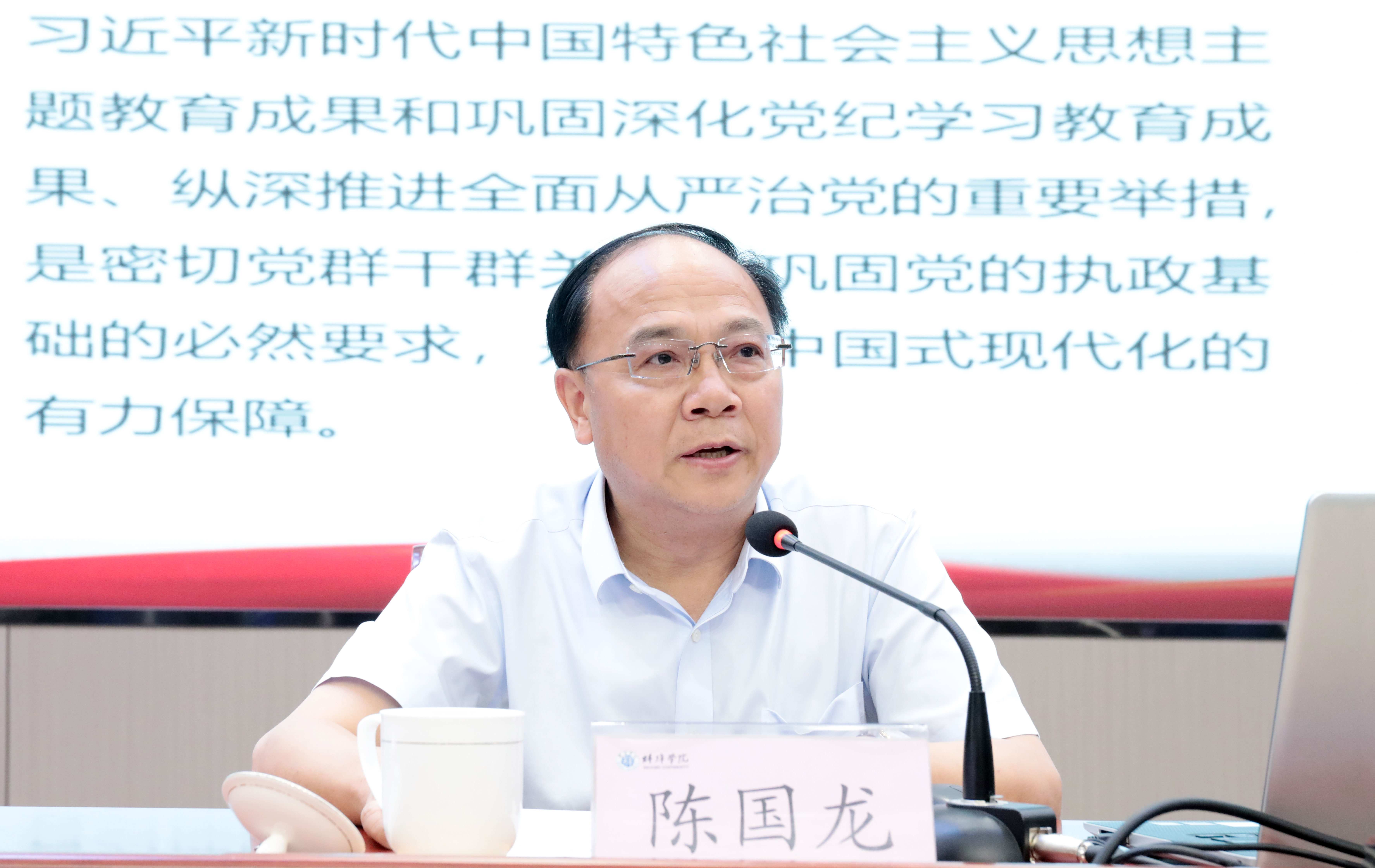 会上,校党委书记陈国龙讲授“七一”专题党课。党课围绕“深刻领会习近平总书记关于加强党的作风建设的重要论述、深刻认识中央八项规定取得的历史性成就”,阐述开展学习教育的时代背景和重大意义。同时,结合学校实际强调要持续强化理论武装,在学有质量上下真功见实效。抓实研讨交流“深入学”,强化警示教育“震慑学”,聚焦关键群体“示范学”,学深悟透,推动学习教育走深走实。要持续查摆问题不足,在查有力度上下真功见实效。全面查摆自身找问题,深入调查研究找问题,结合反馈意见找问题,让问题查摆更精准、集中整治更有效。要持续开展问题整治,在改有成效上下真功见实效。明确责任、扭住重点、建章立制,一改到底。要持续扛牢责任担当,在推动发展上下真功见实效。以更实作风抓好巡视整改、迎接审核评估、推进创硕攻坚,紧紧把握住学校快速发展的难得契机,为实现学校高质量发展书写新的辉煌篇章。