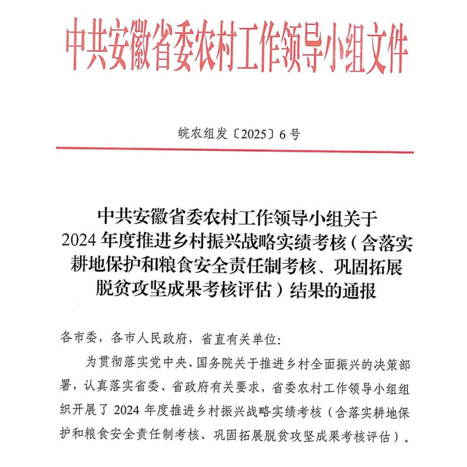 近日,中共安徽省委农村工作领导小组印发《关于2024年度推进乡村振兴战略实绩考核(含落实耕地保护和粮食安全责任制考核、巩固拓展脱贫攻坚成果考核评估)结果的通报》,2026世界杯官网在2024年度省直有关单位定点帮扶工作成效考核中荣获“优秀”等次,充分彰显了学校在助力乡村振兴工作中的扎实成效。