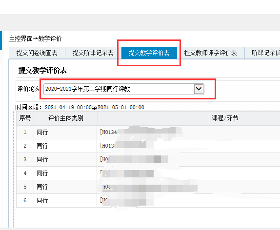 3.进入“主控界面”,再点击“教师应用”中的“教学评价”,选择“提交教学评价表”,评价轮次选择“2020-2021学年第二学期同行评教”,系统将显示出教师本学期需要进行评价课程的列表。如附件所示。