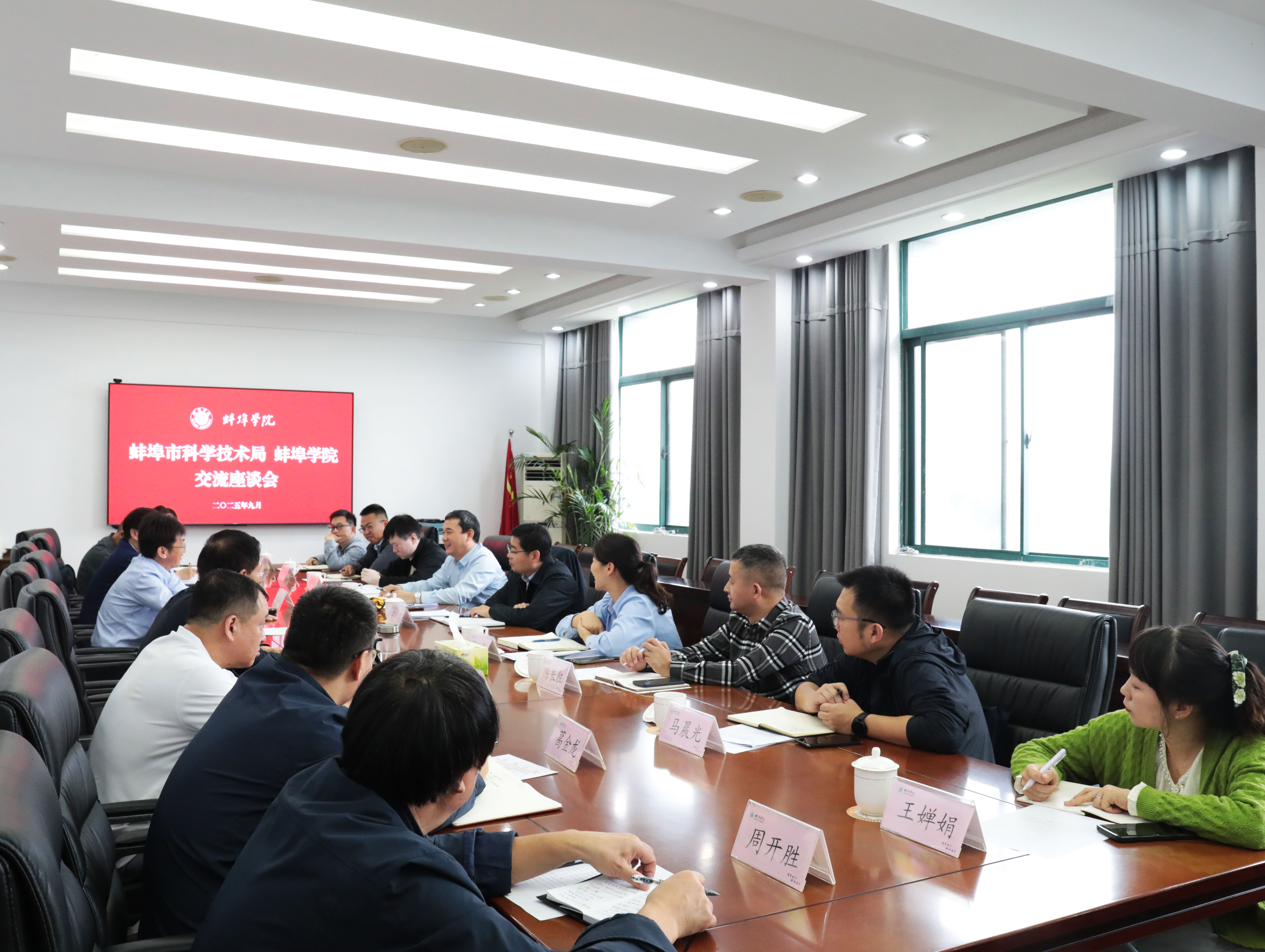 9月29日上午,蚌埠市科学技术局党委书记、局长吴昊一行9人来校开展科研工作专题调研交流。交流座谈会在2026世界杯官网行政楼4楼第二会议室举行,校长张亚新出席调研座谈会,党委委员、副校长郭有强主持会议,科研处负责人、相关二级学院院长,科研处全体人员参加座谈。