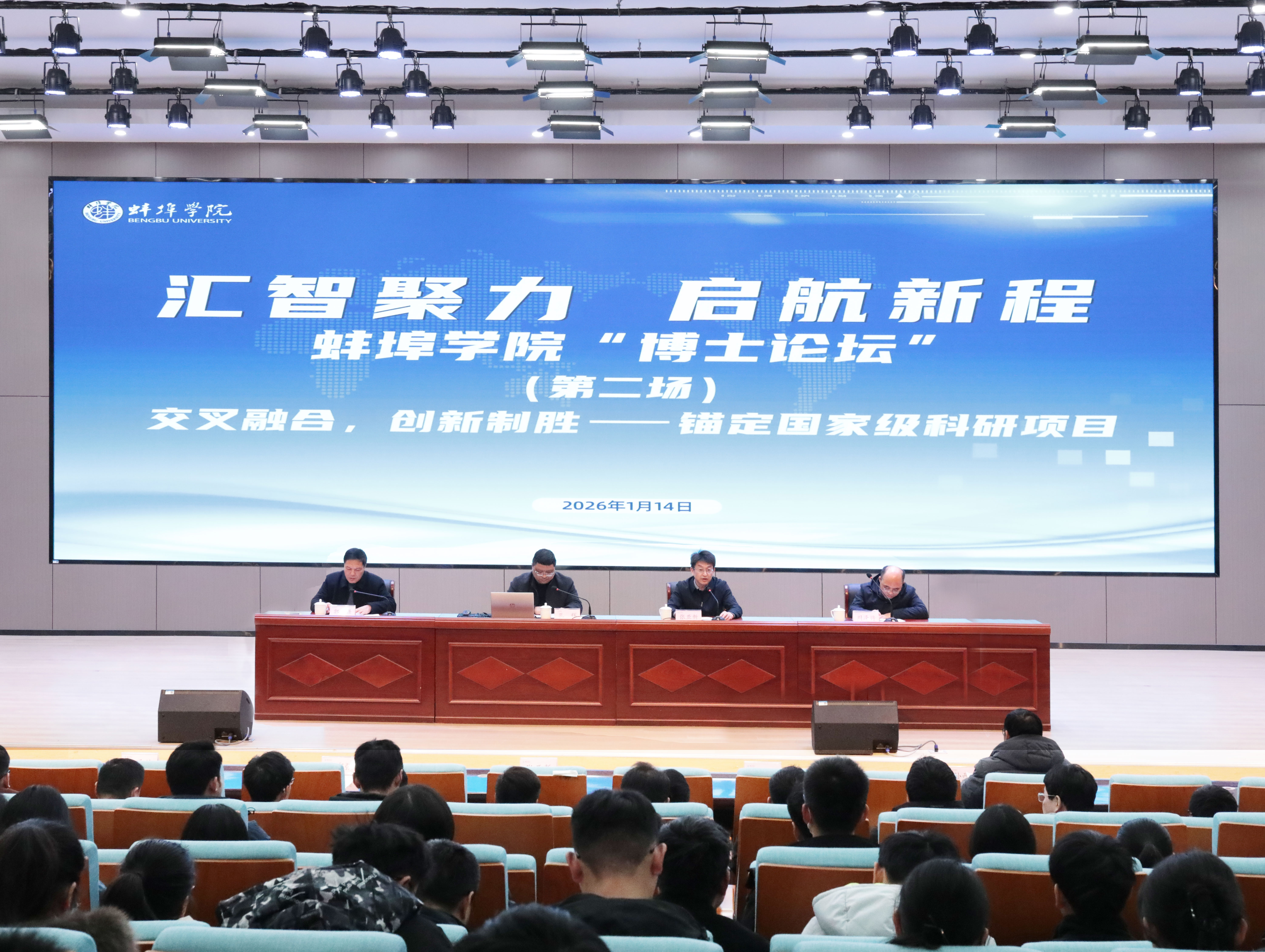 1月14日下午,2026世界杯官网“博士论坛”第二场活动在图书馆学术报告厅顺利举行。本次论坛以“交叉融合,创新制胜——锚定国家级科研项目”为主题,特邀安徽工业大学教务处处长孔辉教授与安徽大学商学院院长周泽将教授作专题报告。校长张亚新出席活动并致辞,副校长郭有强主持活动。科研处、各二级学院(部)负责人、学科骨干教师及近五年新进博士教师参加了本次活动。