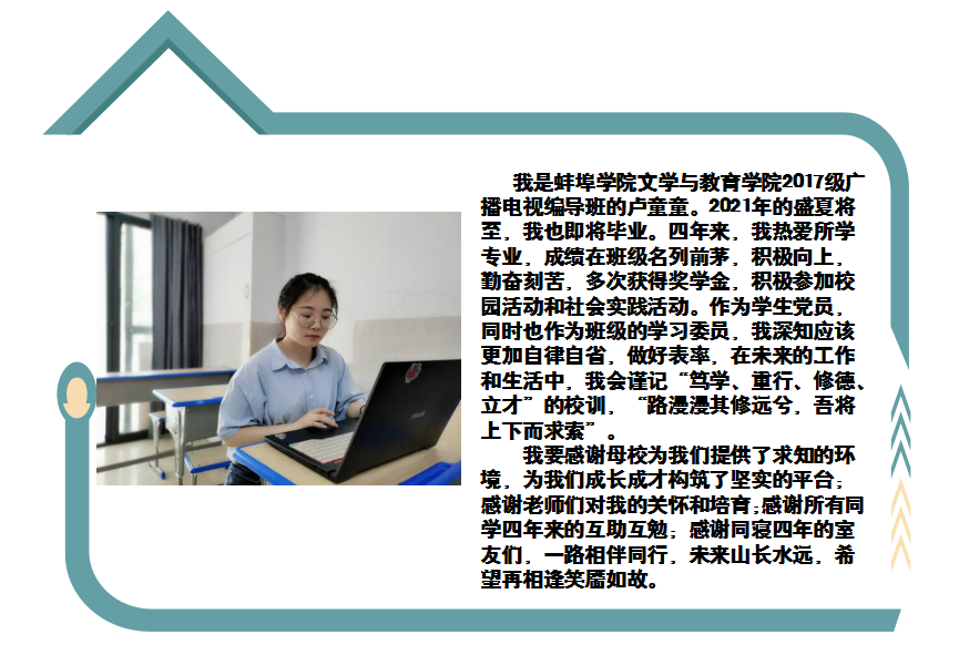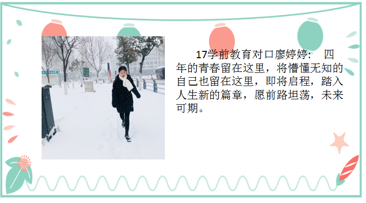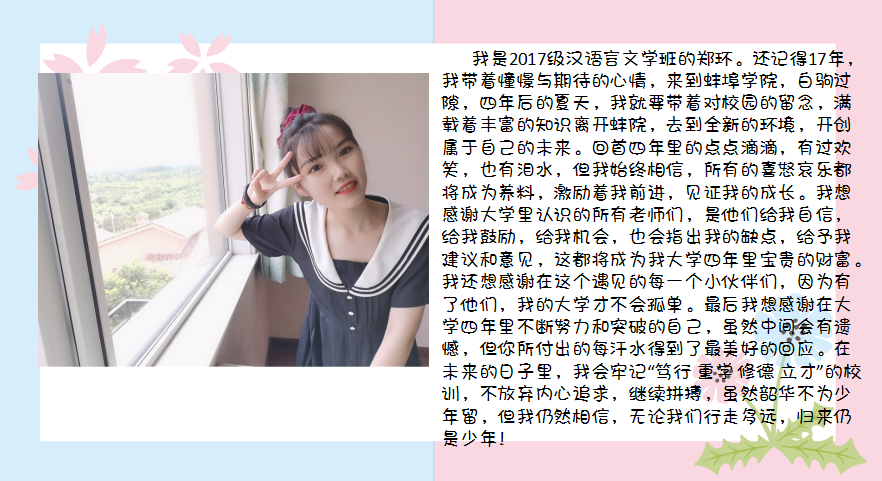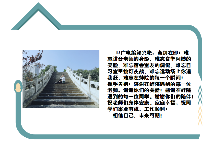 在这里,四个希冀的春天,我们播种了四次希望;四个金黄的秋天,我们收获了四遍硕果;在这里,我们曾经经历了四个炎夏的磨砺和四个寒冬的考验。在这即将告别校园之时,请别忘了这有滋有味有声有色的时光,请别忘了这是我们的蚌院时光。(撰稿:董琬如;编辑:王婷婷)