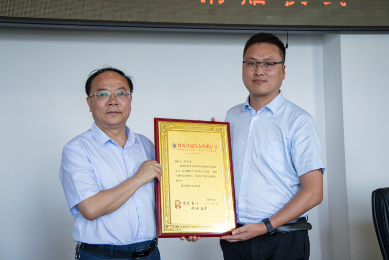 陈国龙代表学校接受捐赠,并为校友企业颁发捐赠证书。
