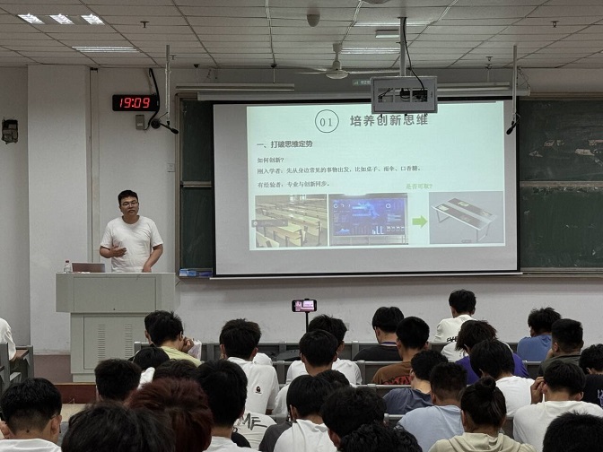 活动伊始,辅导员张婷婷对王创伟校友返校表示热情欢迎,并简要介绍了他参加的创新创业比赛成绩和申请专利成果,勉励大家向榜样学习。在热烈的掌声中,王创伟校友向在场同学讲述了自己在创新领域的心路历程。他明确指出,创新绝不仅仅停留在理念的层面或一个单纯的想法,更是一个需要倾注辛勤努力与坚定信念的漫长过程。他鼓励同学们要善于把握自身的专业优势,勇于尝试新颖的方法和思路,敢于突破自我,积极投身于创新的实践中。