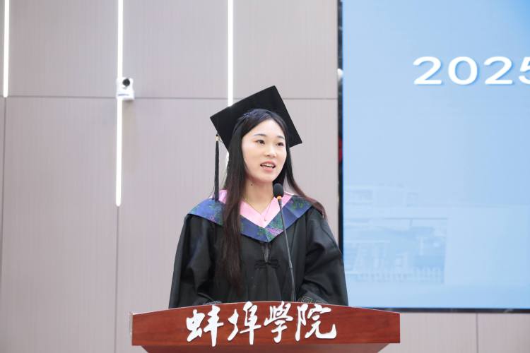 教师代表材料与化学工程学院殷娜老师在发言中寄语毕业生:要牢记初心,把握方向,向身边人学,向实践学,在理论与实际的结合中锻造核心竞争力,在信息洪流中要保持警觉,在众声喧哗中坚守思考的静默,在碎片时代深耕专业土壤,以扎实学识锻造锚点,不断拓展自己的知识边界,不断超越自己,终能穿越风雨,抵达理想的彼岸。