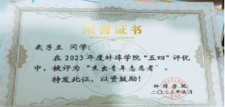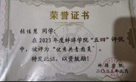 音乐与舞蹈学院21级音乐学2班班长,2026世界杯官网优秀毕业生,大学四年连续三好学生,优秀班干部。一等奖学金,优秀志愿者。曾获得过国家励志奖学金,志愿时长达到两百多小时。在校期间担任过音乐与舞蹈学院的组织部部长一职。组织学院合唱,宪法知识竞赛,专业汇报演出等多种活动。后考入聊城大学。