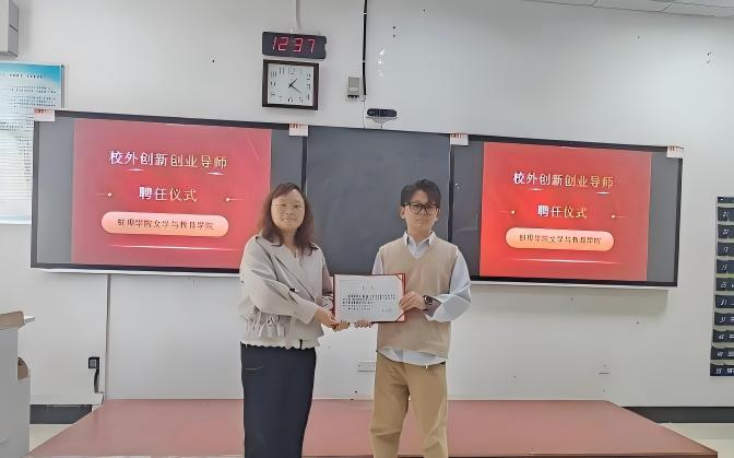 活动伊始,学院举行了校外创新创业导师聘任仪式。学院党委副书记蒋晟为胡凯颁发聘书,正式聘请他担任校外创新创业导师,并邀请他参与大学生创业孵化基地在孵团队的指导工作,指导帮助在校学子的创业之路。