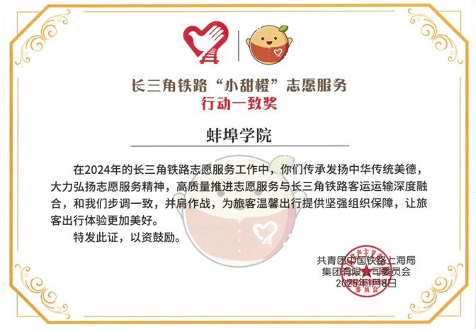 三月春风暖人心,雷锋精神代代传。在刚刚过去的学雷锋月里,世界杯官网志愿服务工作再添殊荣。近日,中国铁路上海局集团有限公司授予世界杯官网2026年长三角铁路"小甜橙"志愿服务"行动一致奖",这是世界杯官网继2025年首次获此殊荣后,连续第二年摘得该项荣誉。荣誉的背后,是数理学院九年深耕铁路志愿服务的坚守,更是学子们在每个节假日、周末用青春热血书写的暖心答卷。“橙”意满满,荣誉见证九年坚守长三角铁路“小甜橙”志愿服务“行动一致奖”,旨在表彰在铁路客运服务中表现突出、与铁路部门配合默契的志愿服务集体。自2017年起,数理学院团总支便组织和开展了与蚌埠高铁站志愿服务结对活动,与铁路志愿服务结下了不解之缘。九年来,每逢国